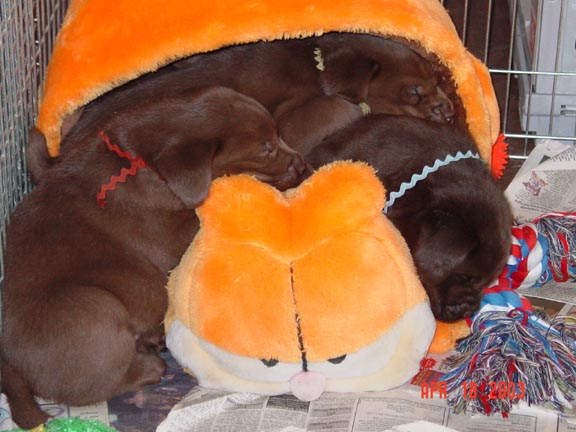 Guess how many pups are in the Garfield cat bed. 04/19/03 -
