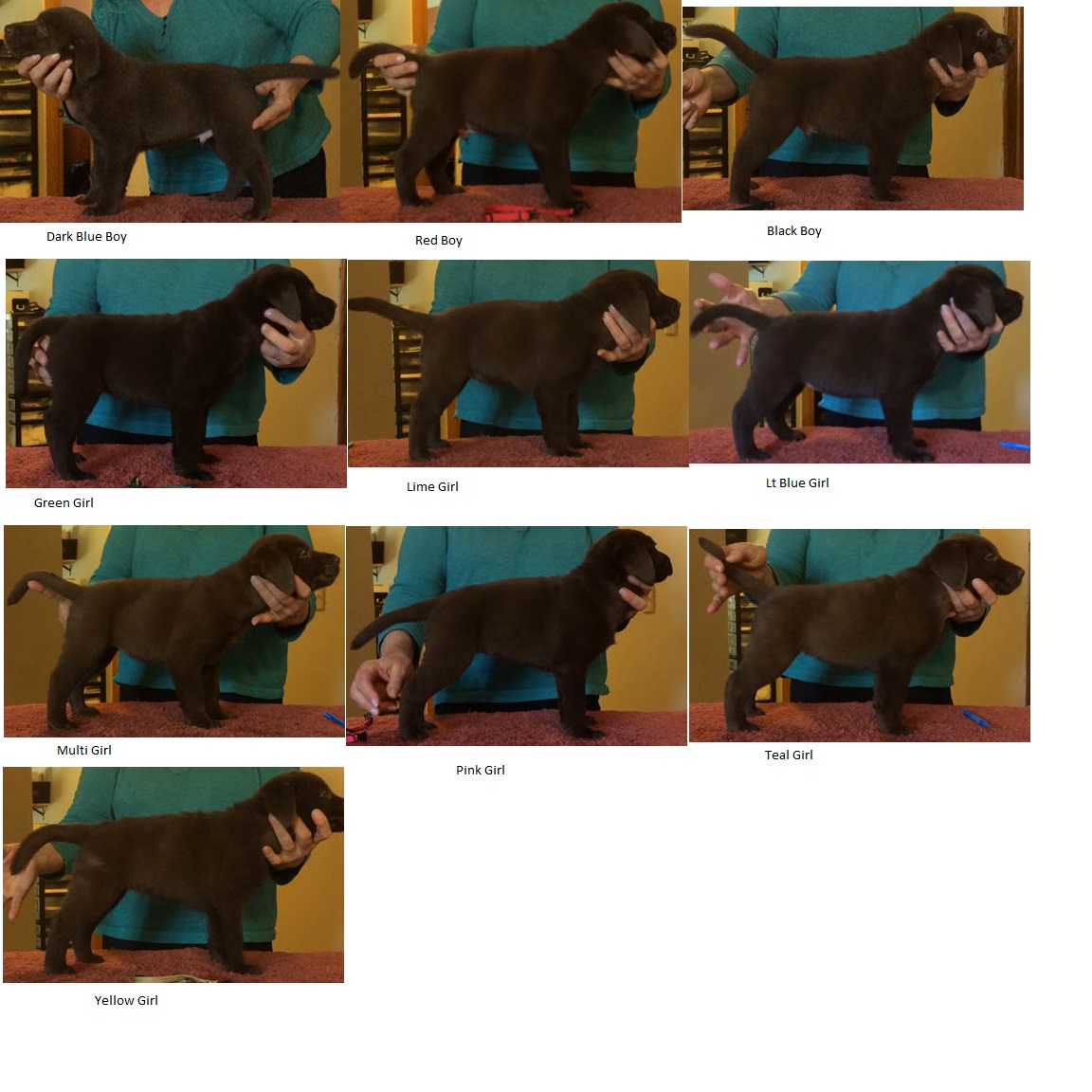 5 weeks old today. The biggest pup is the Teal girl at 5lb 9oz. Red and Dark Blue boys are an ounce behind at 5lb 8oz. The smallest are Light Blue girl and Lime girl at 4lb 12oz. The rest of the pups are right around 5lb 6-7oz. I'll be working on stacks and head shots when they wake up from their nap. We've started moving the feedings out to every 5 hrs and hopefully by 6 weeks it will be 4xday and no more feedings in the middle of the night. They all know their names (color of the collar) and respond to it, even when they are chewing on another pup's ear.
