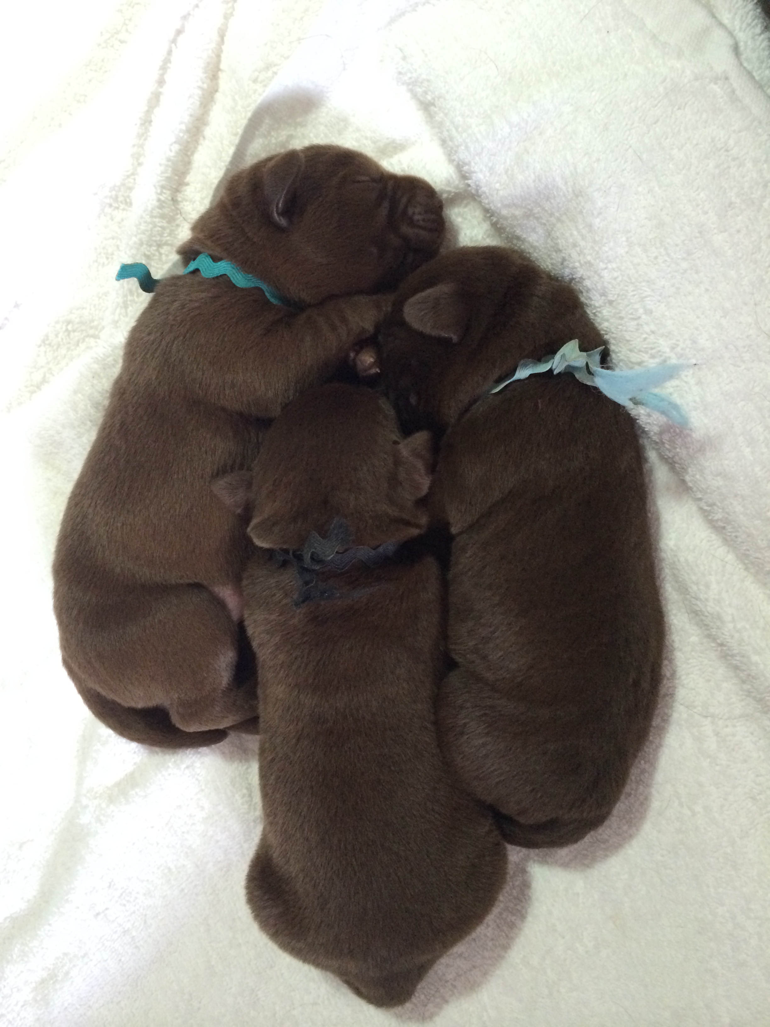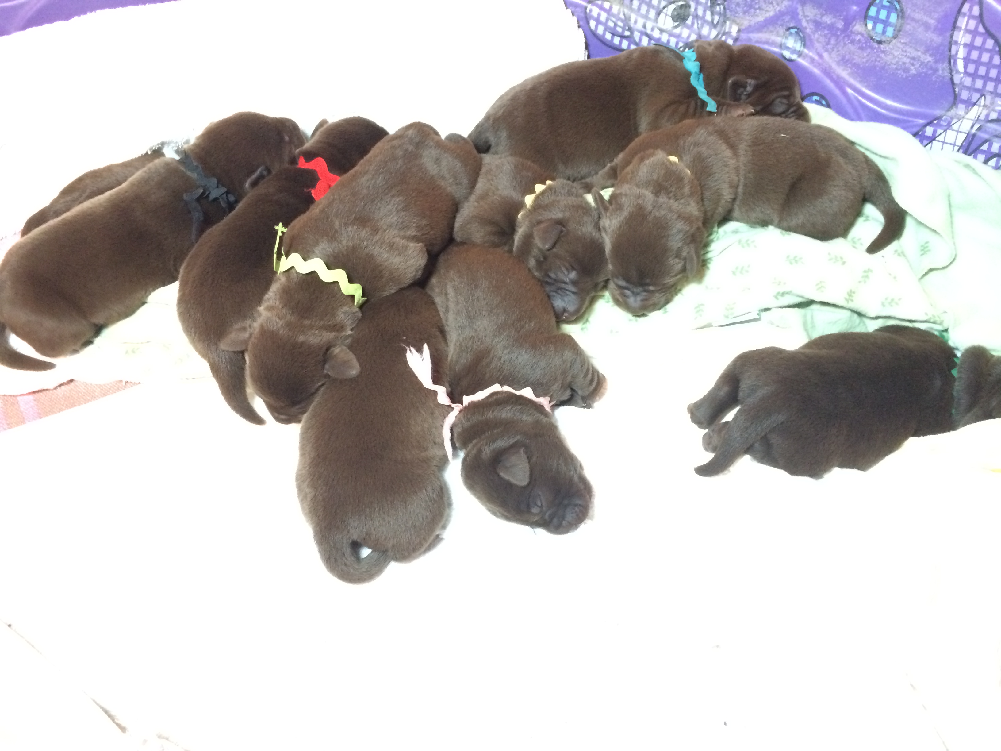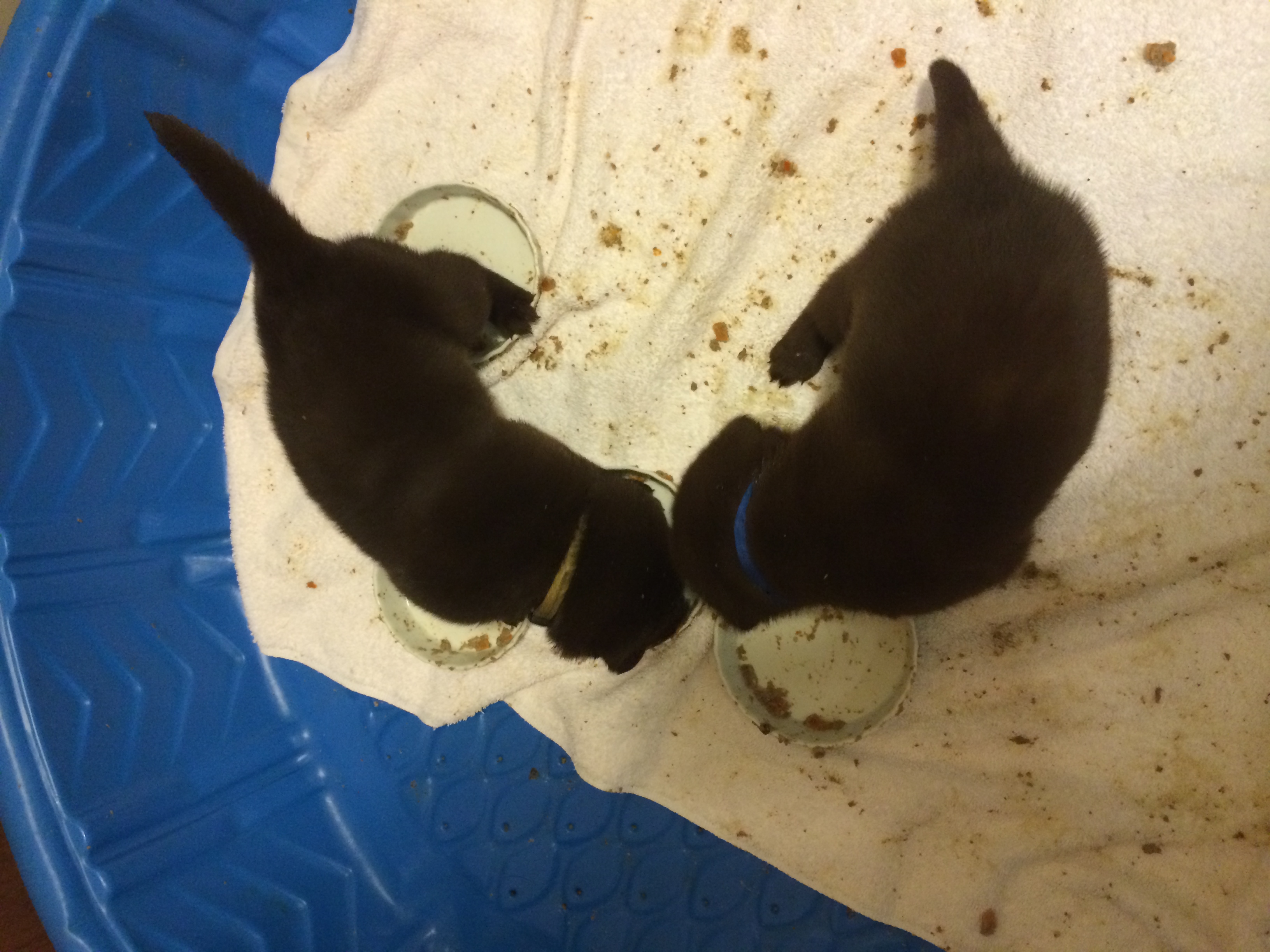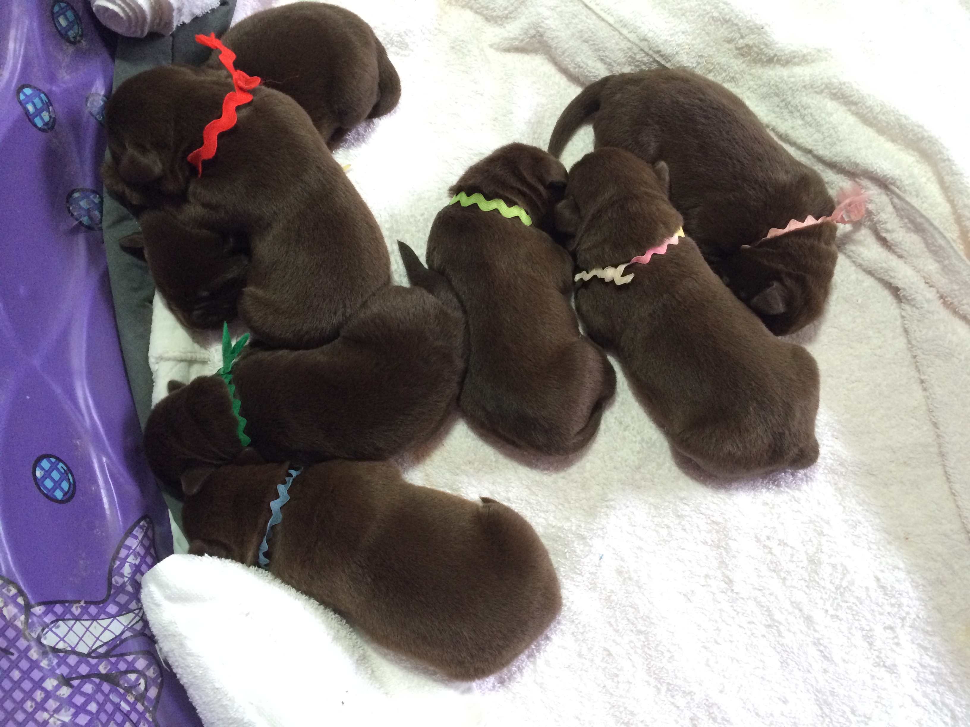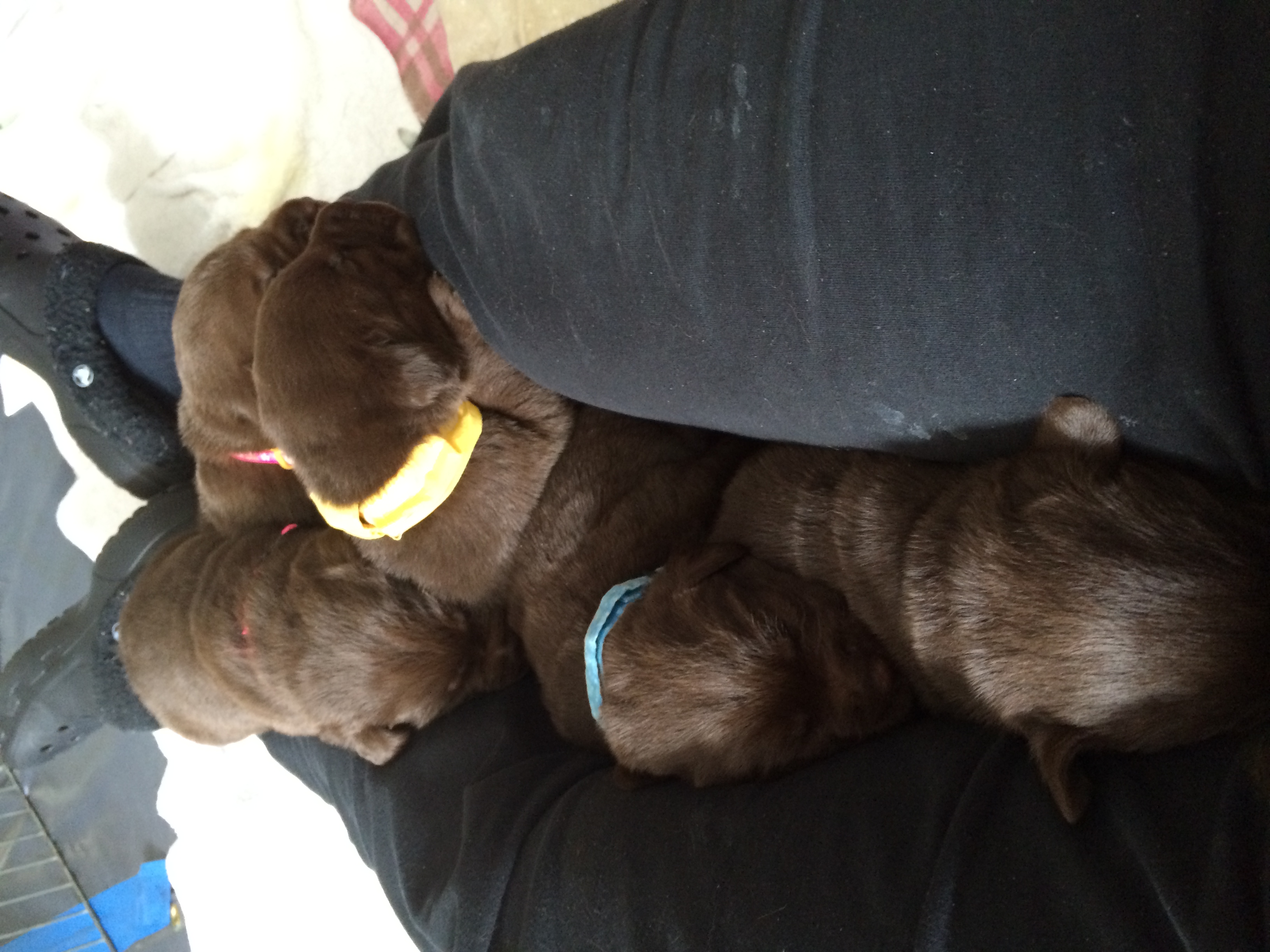 Happy Valentines Day. The chocolates are doing great, eating constantly and some have even put on a couple of ounces. Their dew claws will be removed this afternoon. Trippy is doing well, loving the extra food with yogurt and anything thing else she wants or needs.