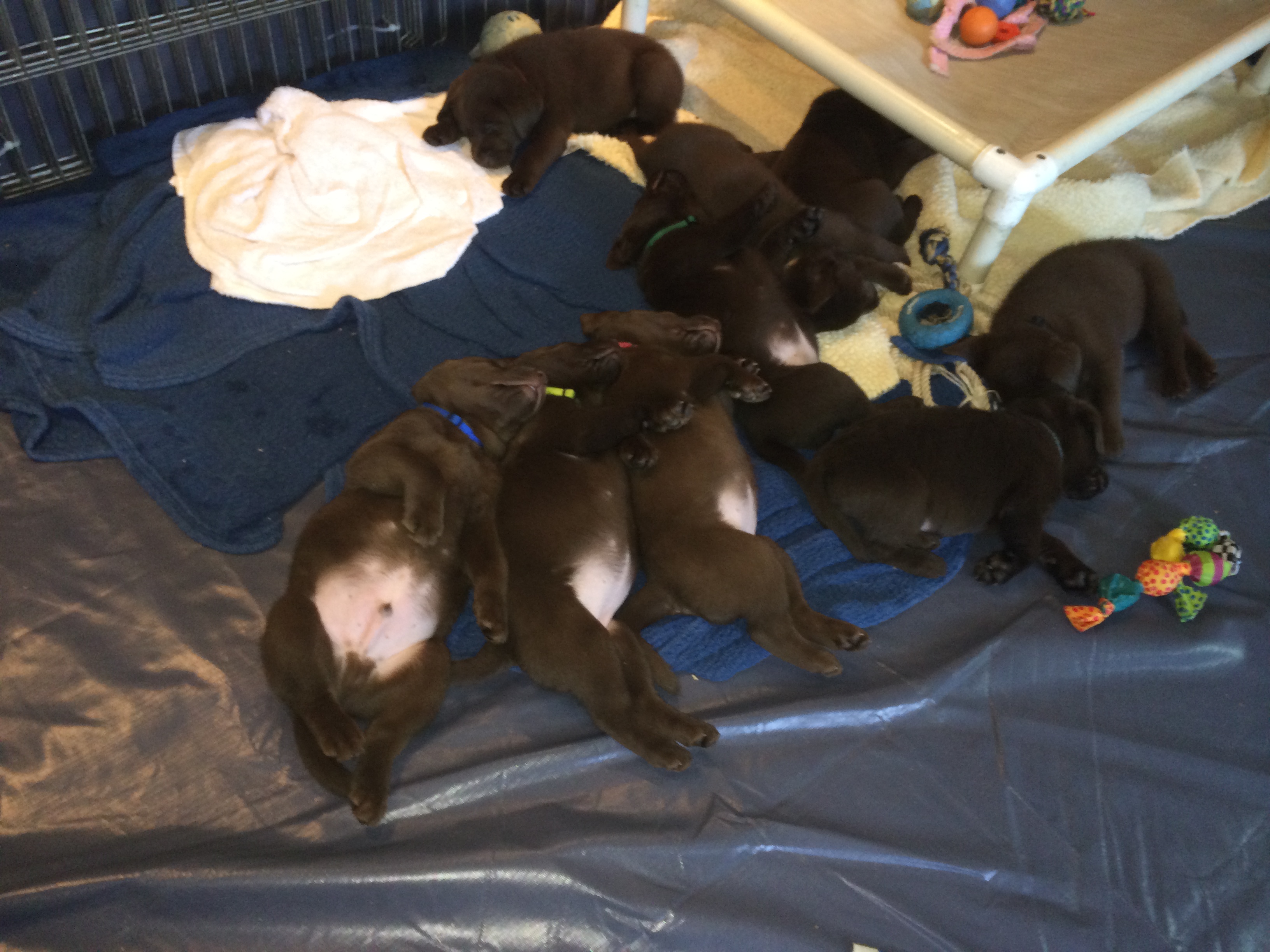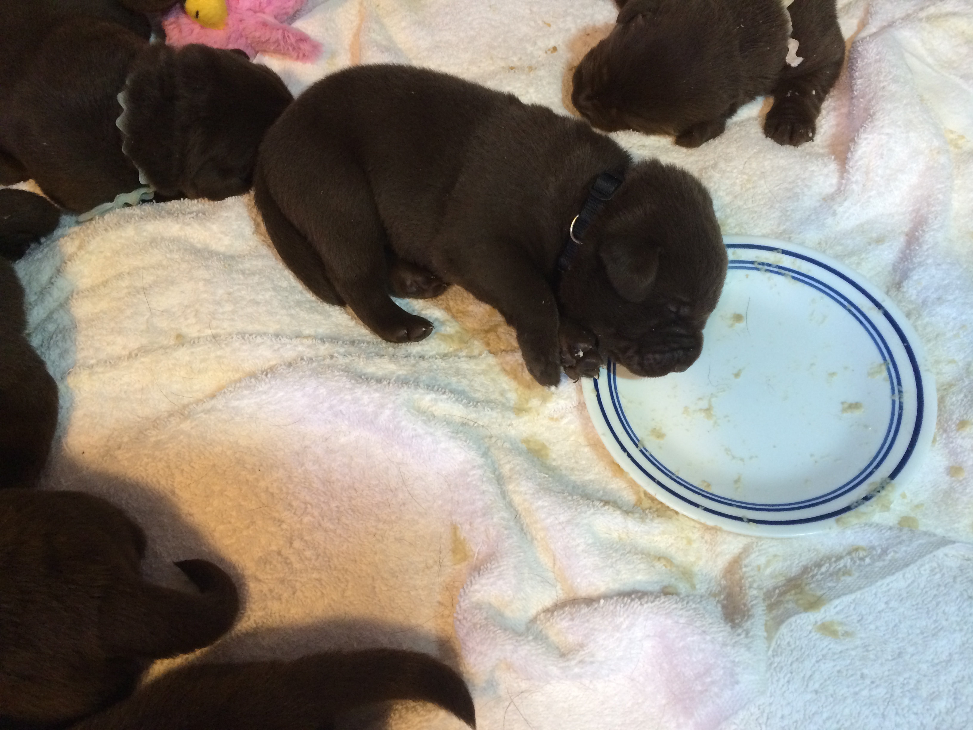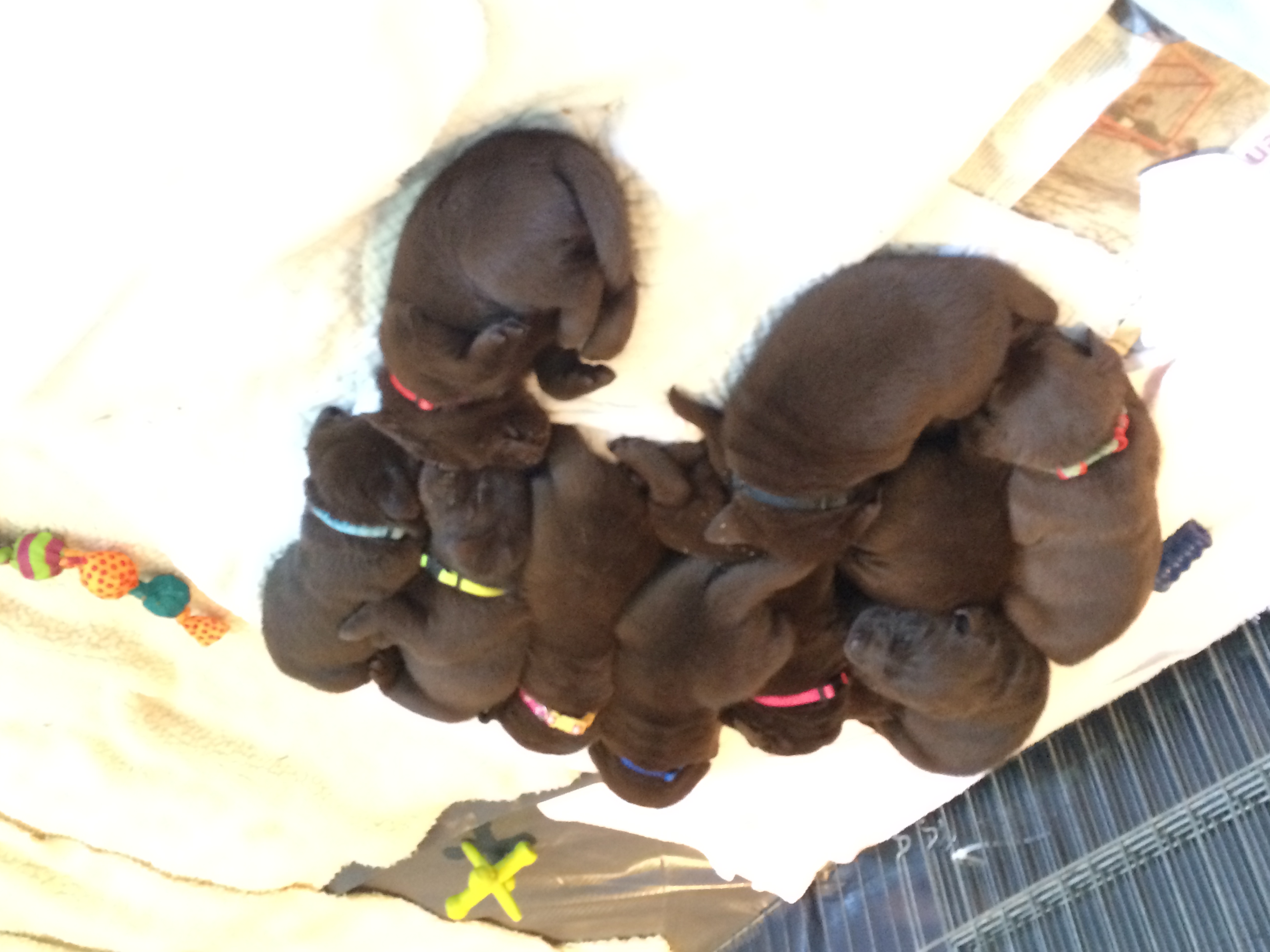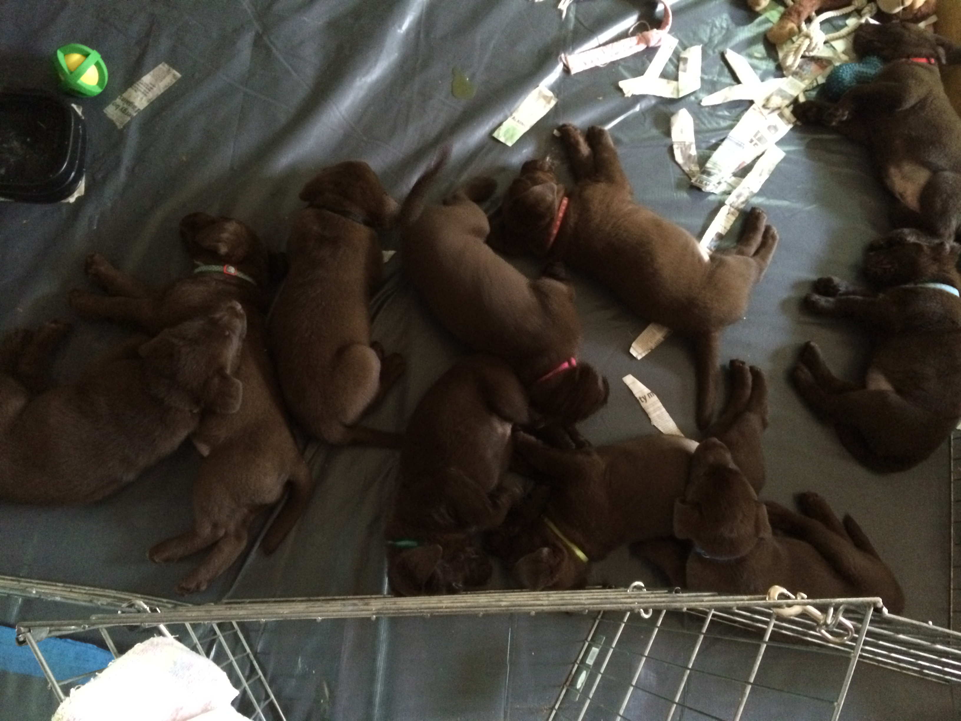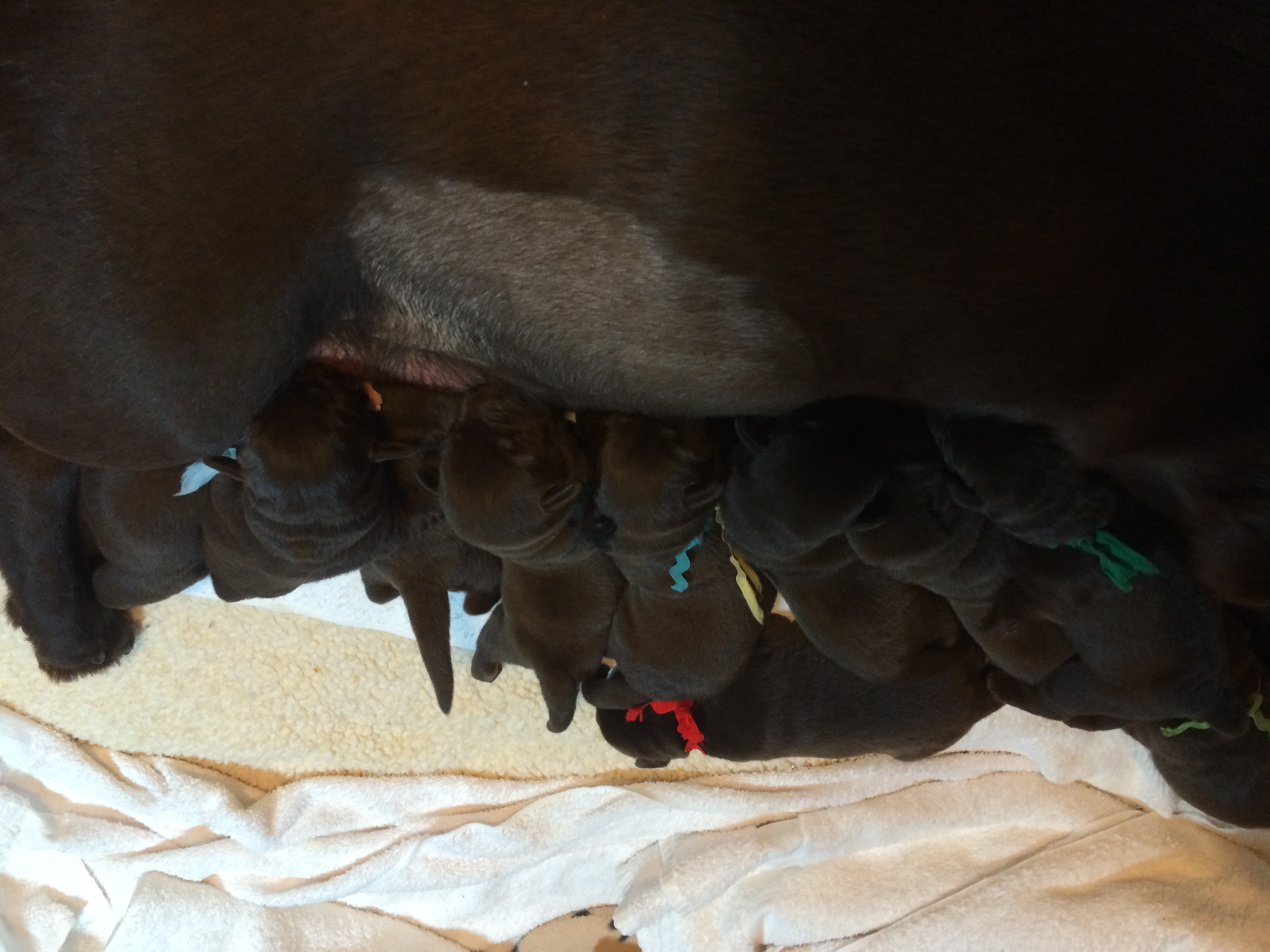 Happy Valentines Day. The chocolates are doing great, eating constantly and some have even put on a couple of ounces. Their dew claws will be removed this afternoon. Trippy is doing well, loving the extra food with yogurt and anything thing else she wants or needs.