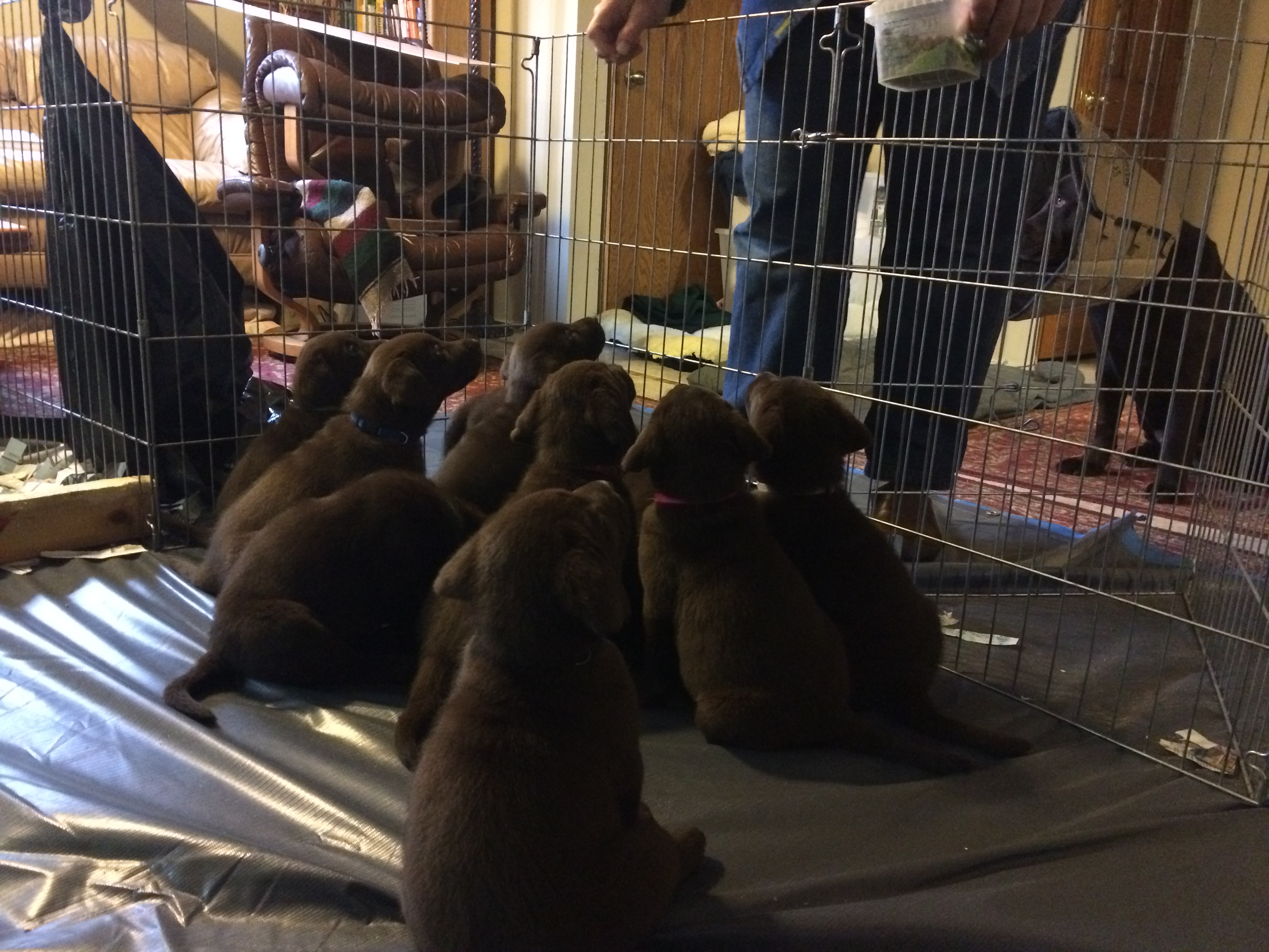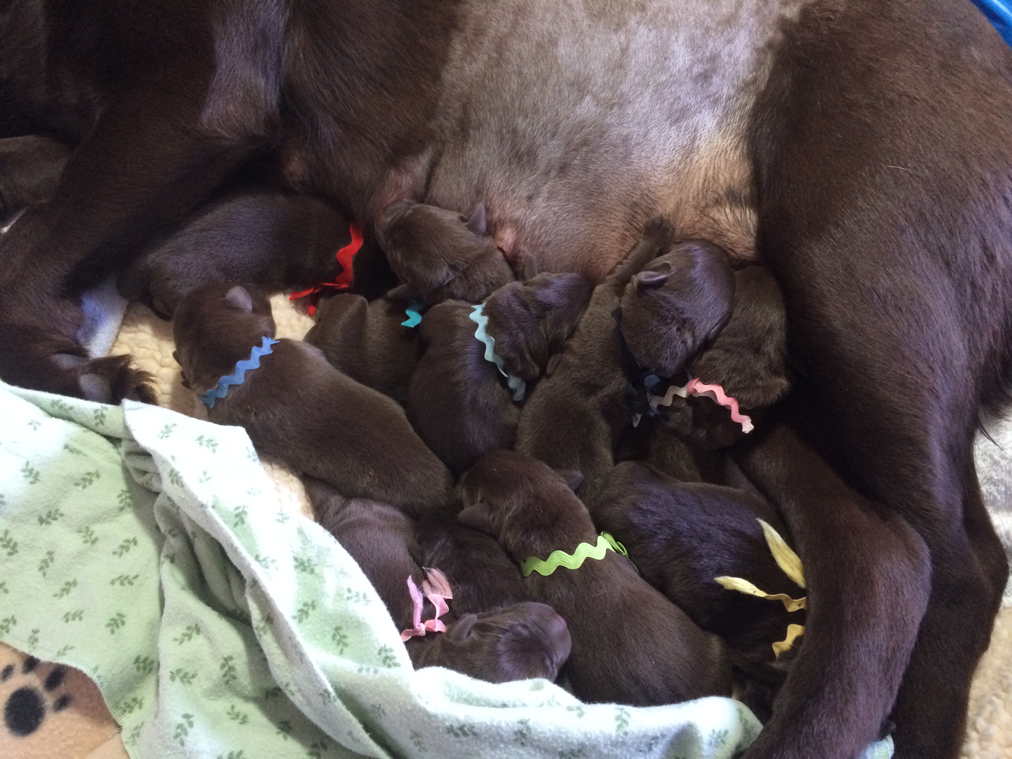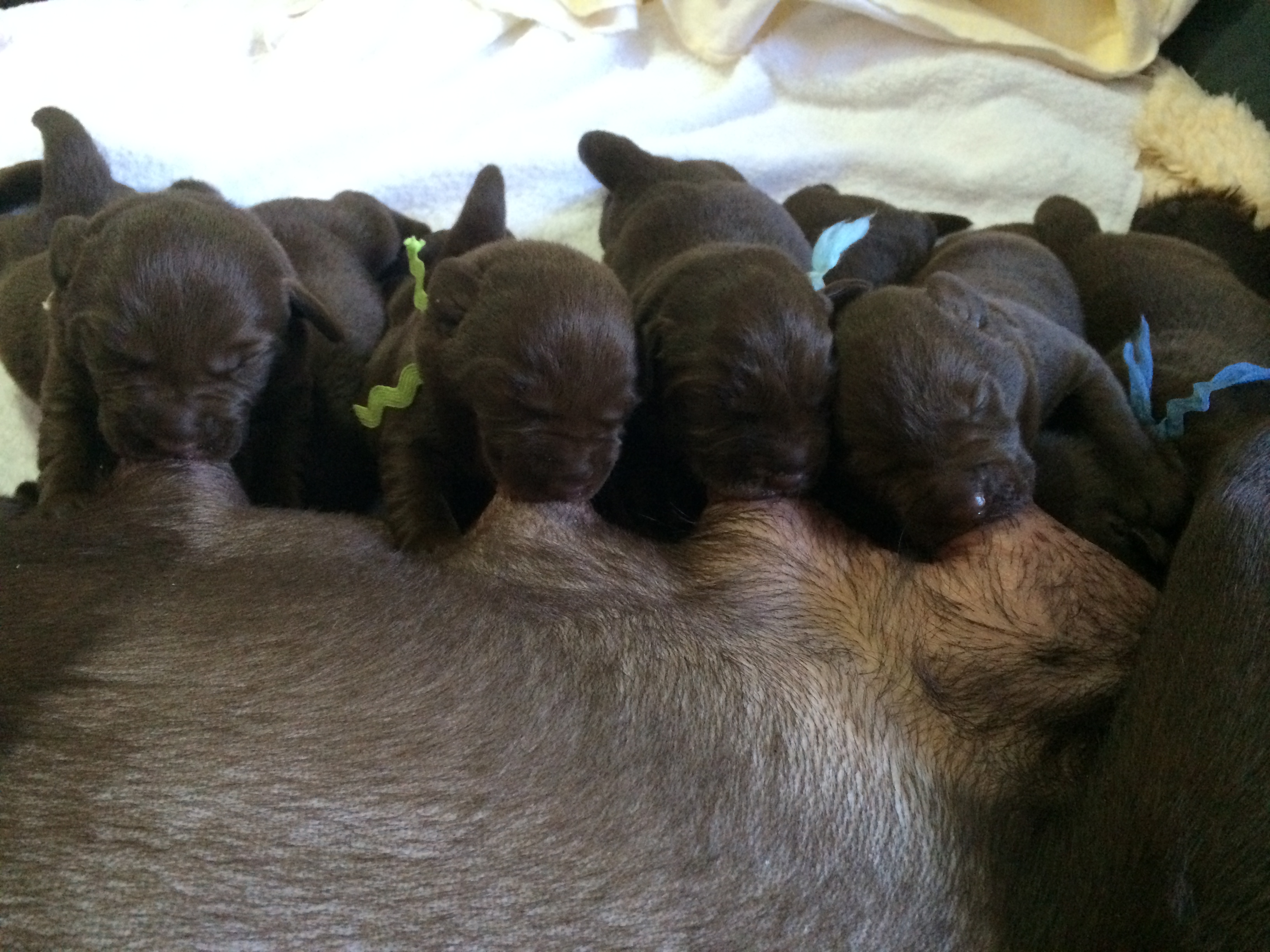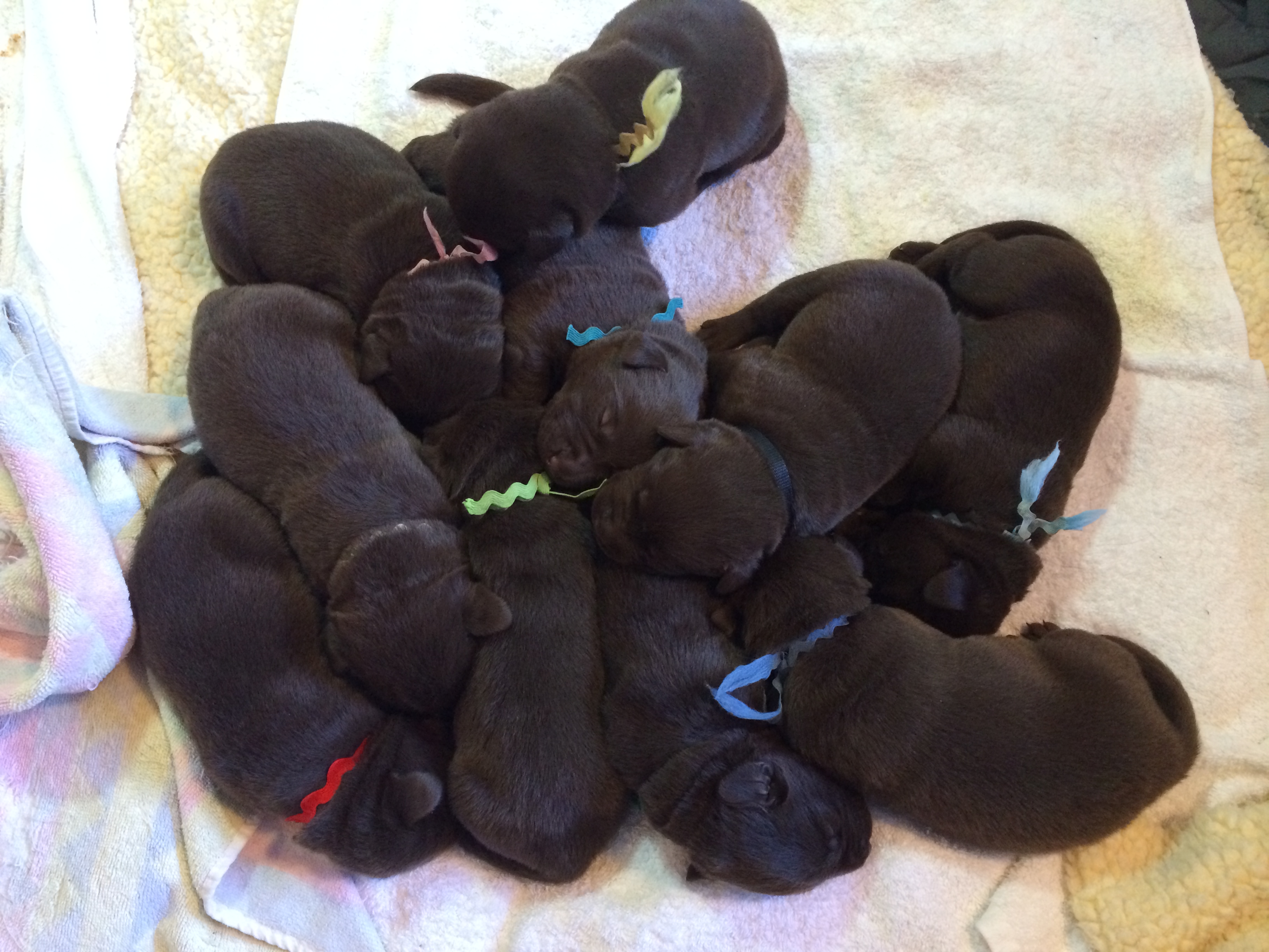 Happy Valentines Day. The chocolates are doing great, eating constantly and some have even put on a couple of ounces. Their dew claws will be removed this afternoon. Trippy is doing well, loving the extra food with yogurt and anything thing else she wants or needs.