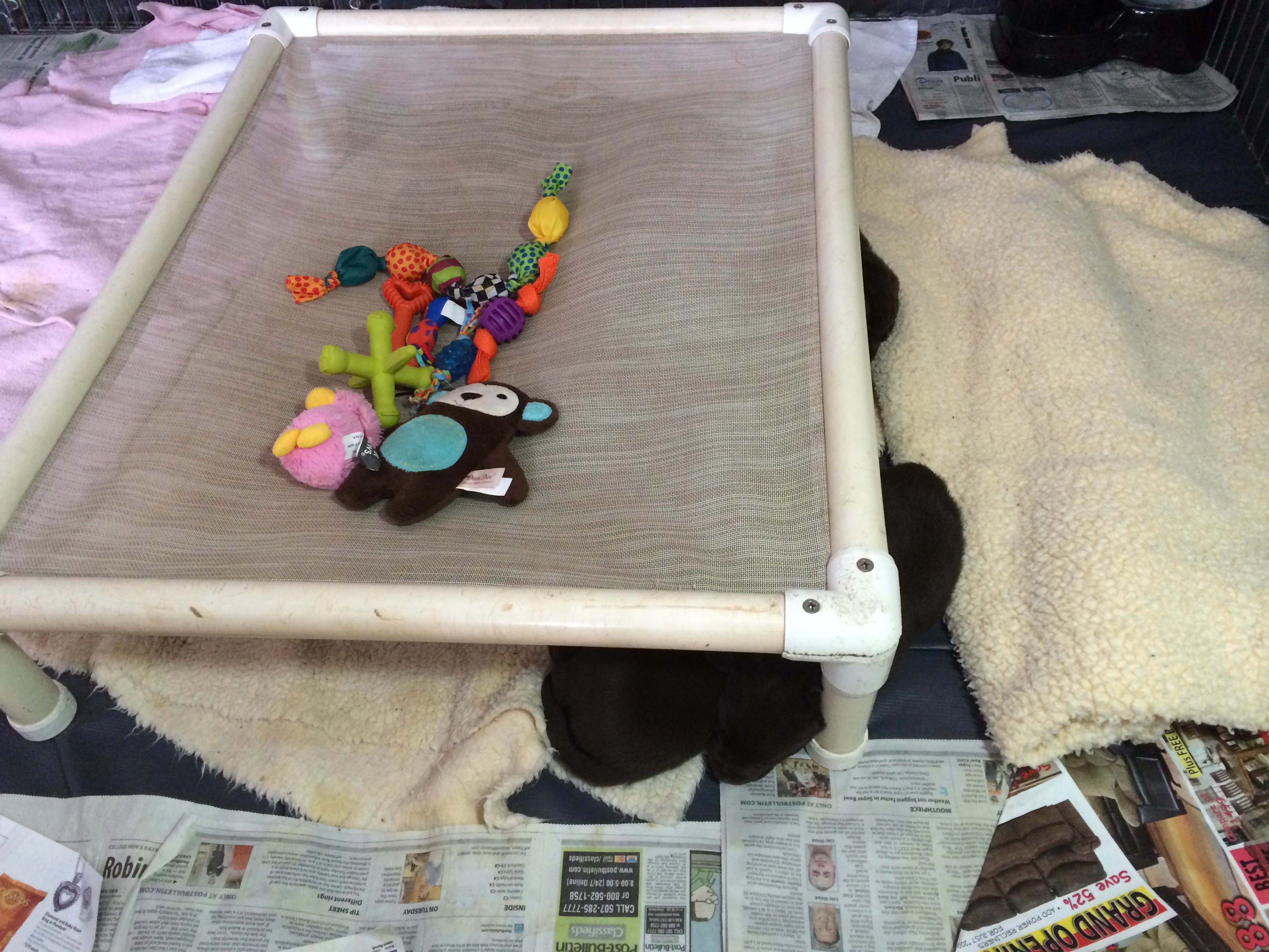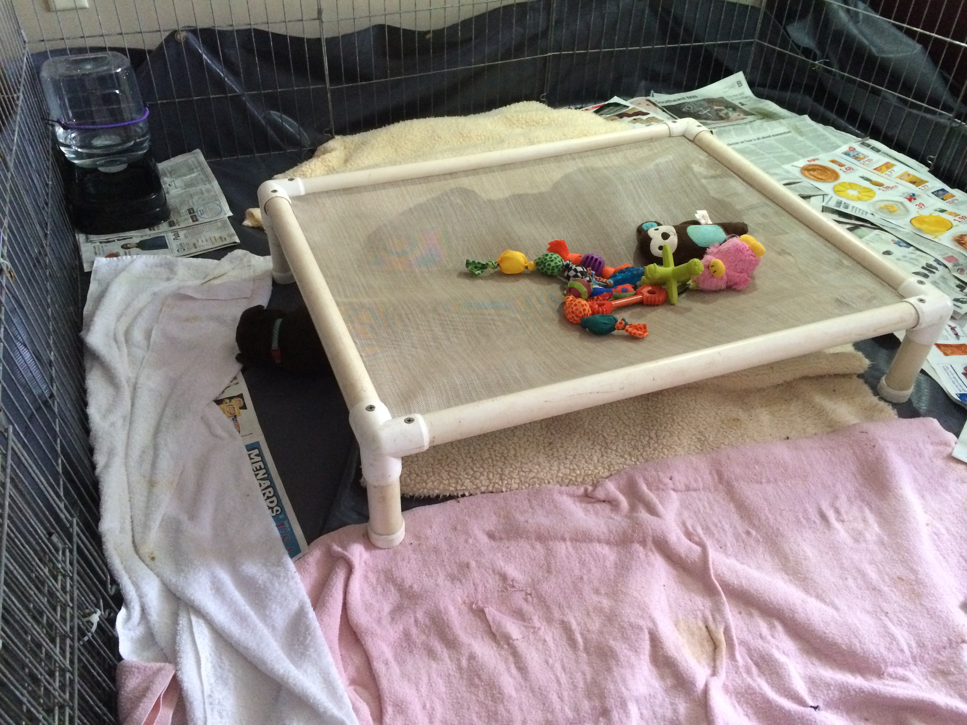 Trippy is very sore and spends most of her time sleeping and healing. The pups have adapted to their new feeding schedule and are learning how to lap up their food. Their teeth are just starting to come in, each day they are getting more noticeable. Since Trippy isn't in the pen with them and they can't cozy up to her, we put in a raised bed for them to hide under.