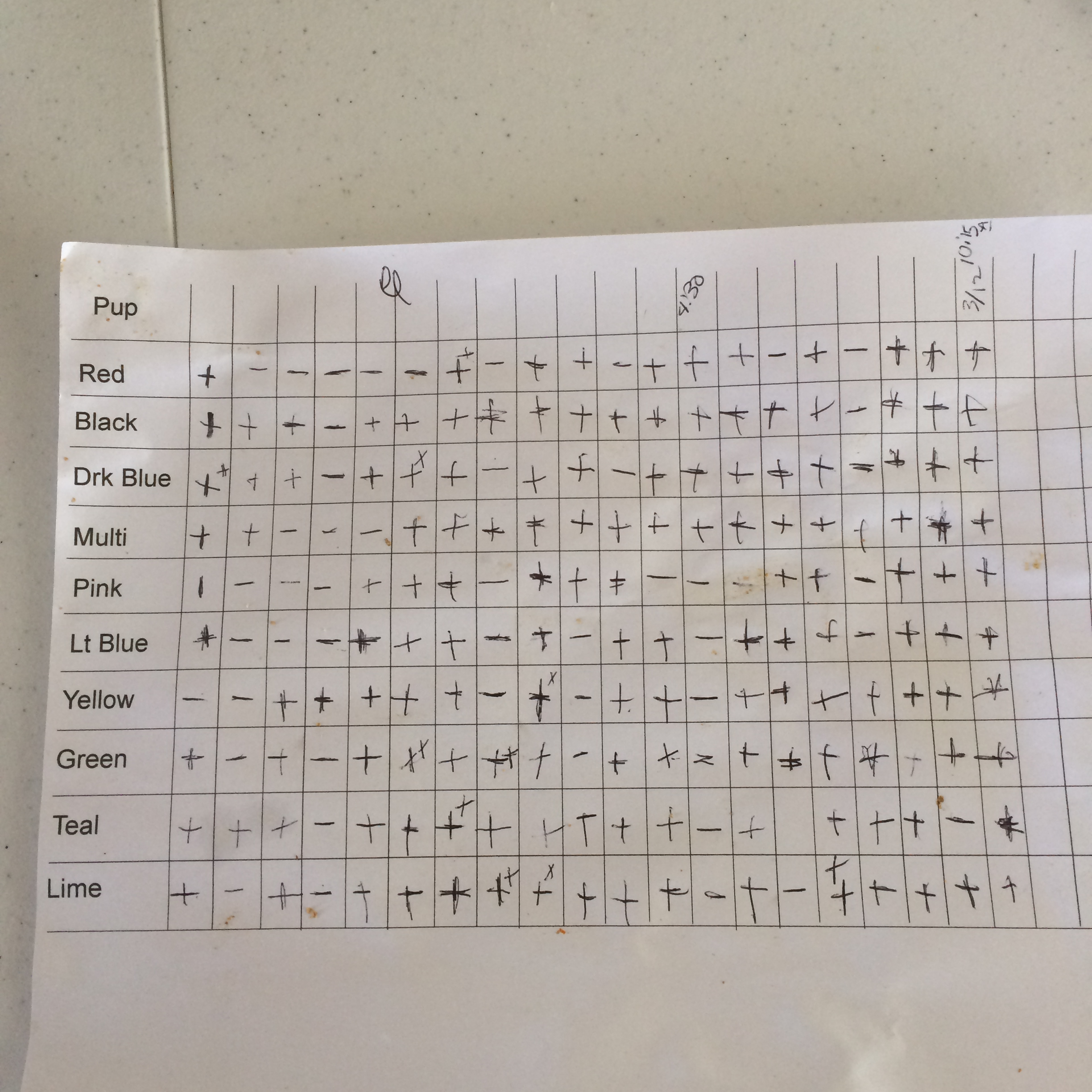 Bookkeeping . Even with the chart there is always one pup that "double dips" and gets a second helping. Morning Snuggle , Playing .