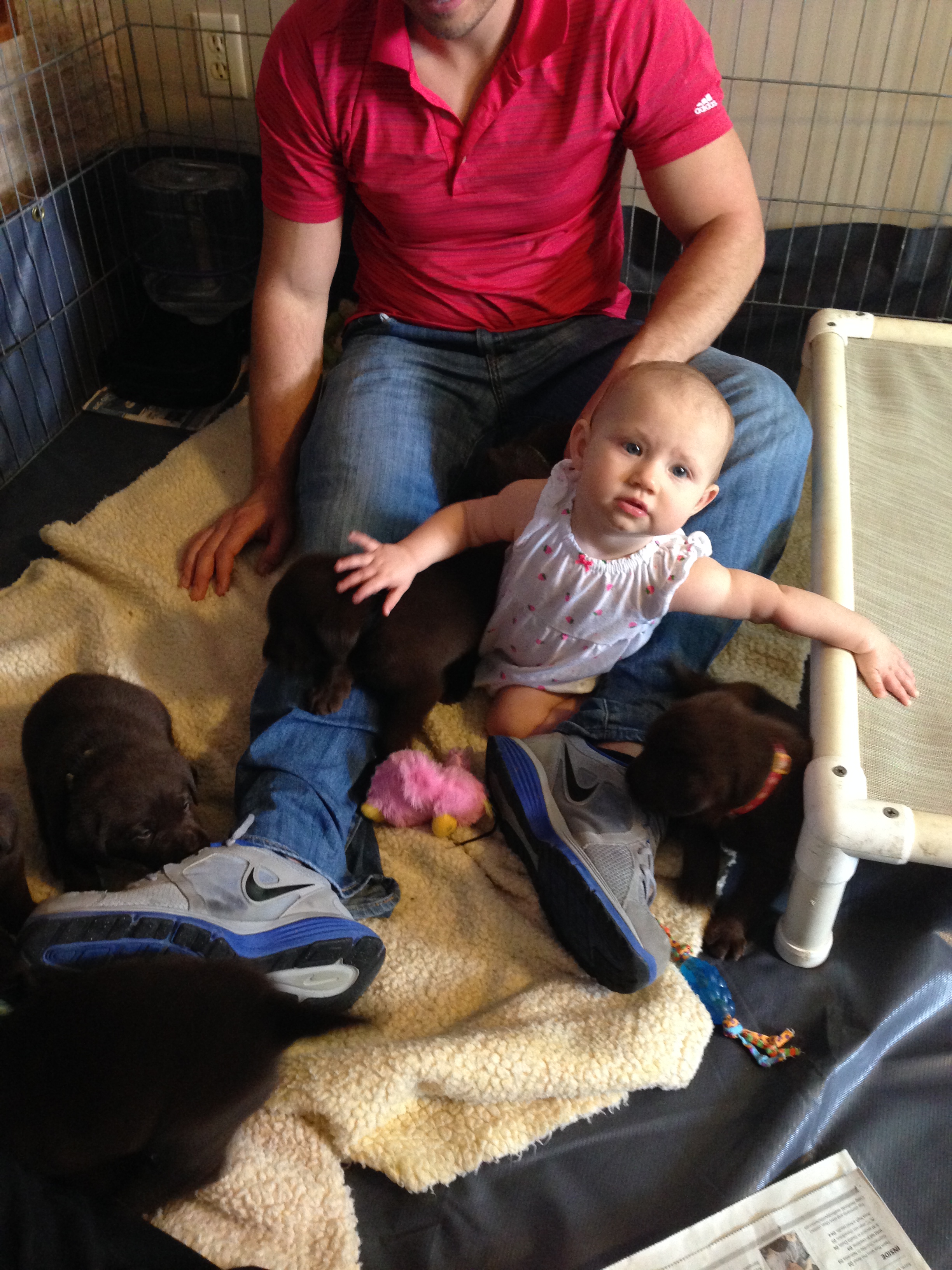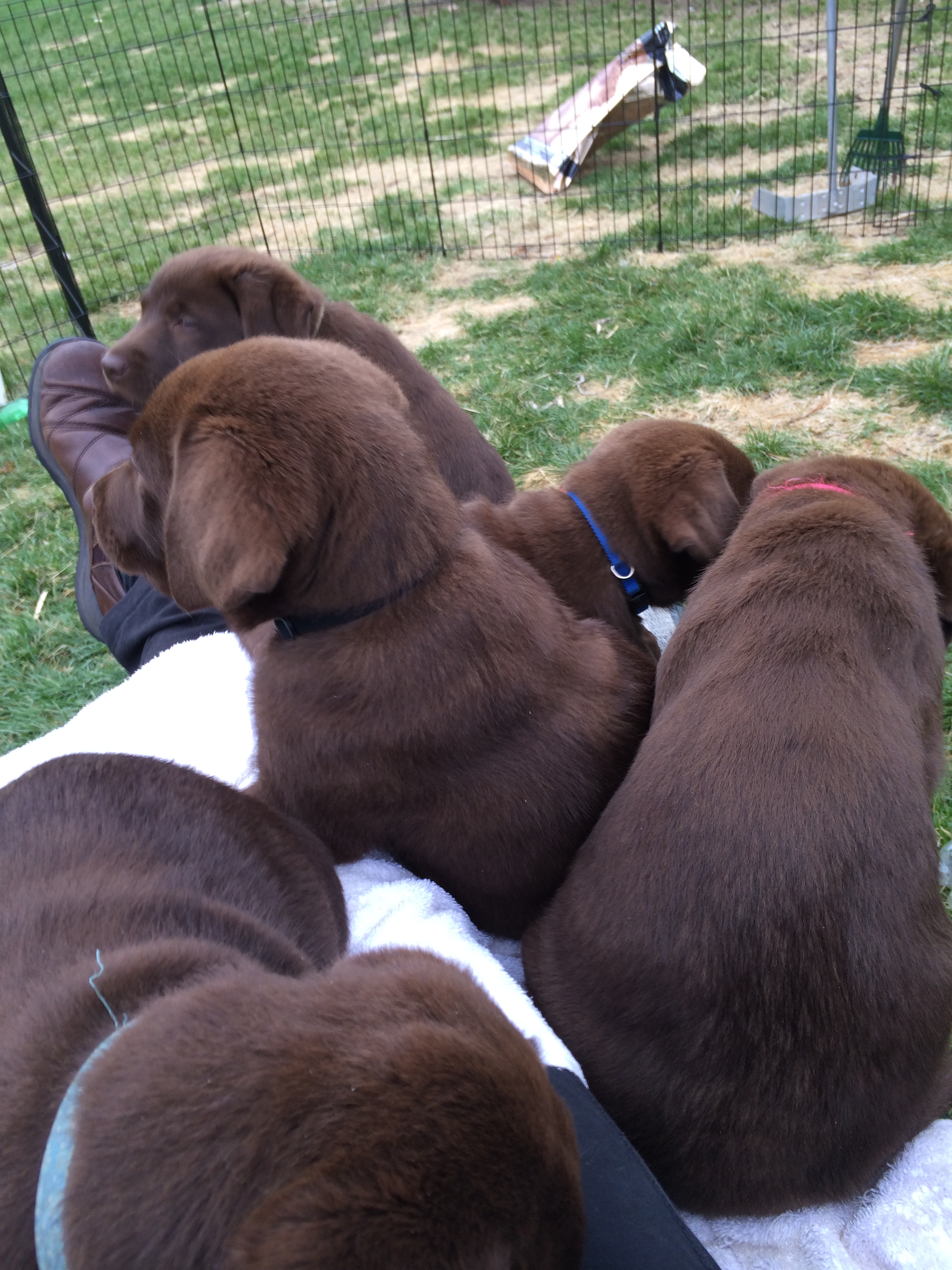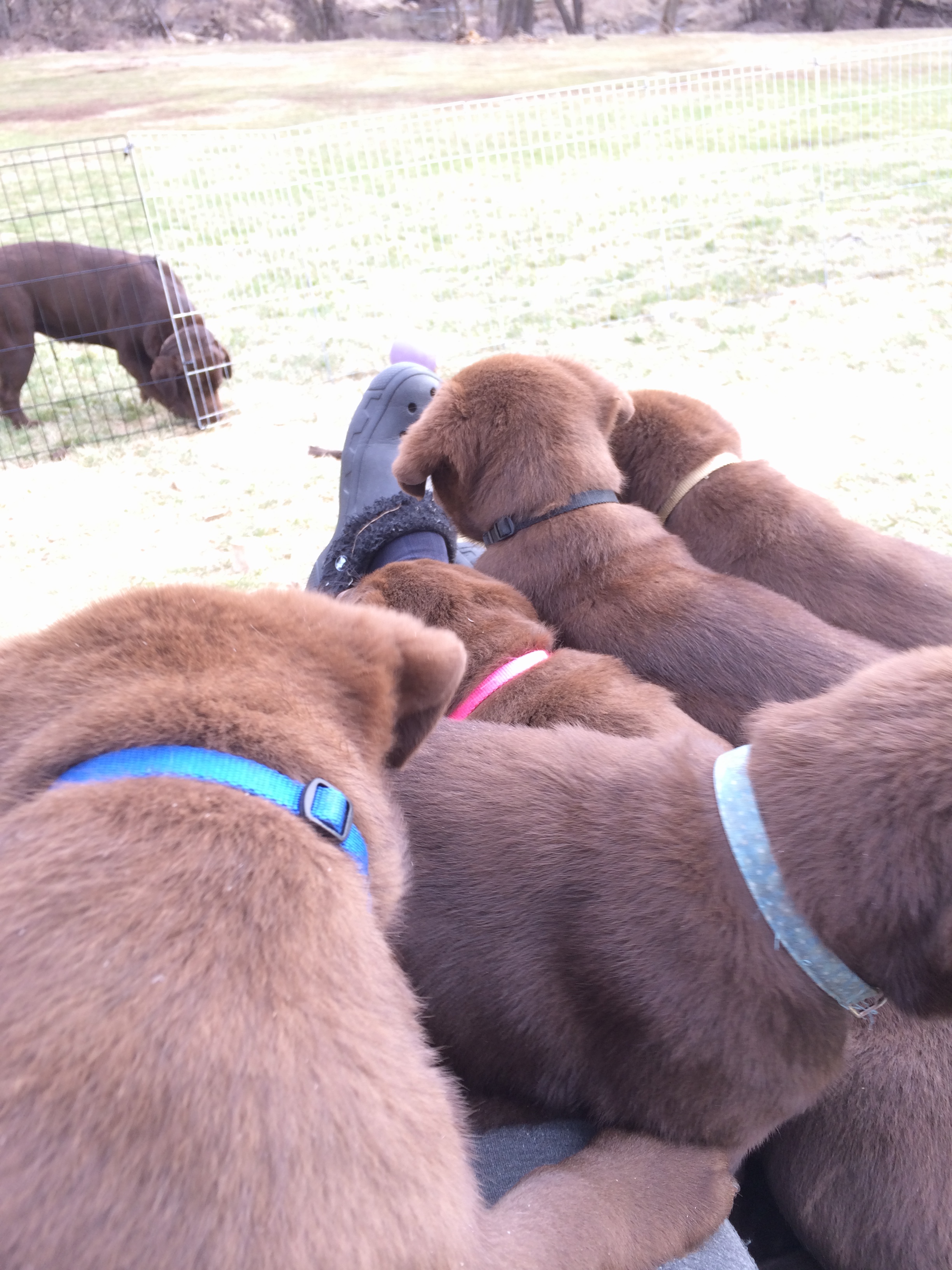 They did well and we were able to take them back inside in groups of 3 or 4 pups. They would follow us and Ellie back into the house. There were a few pups that took excursions into the landscaped area, but eventually made it back into the house. Outside I , Outside II , Outside III , Outside IV , Outside V .