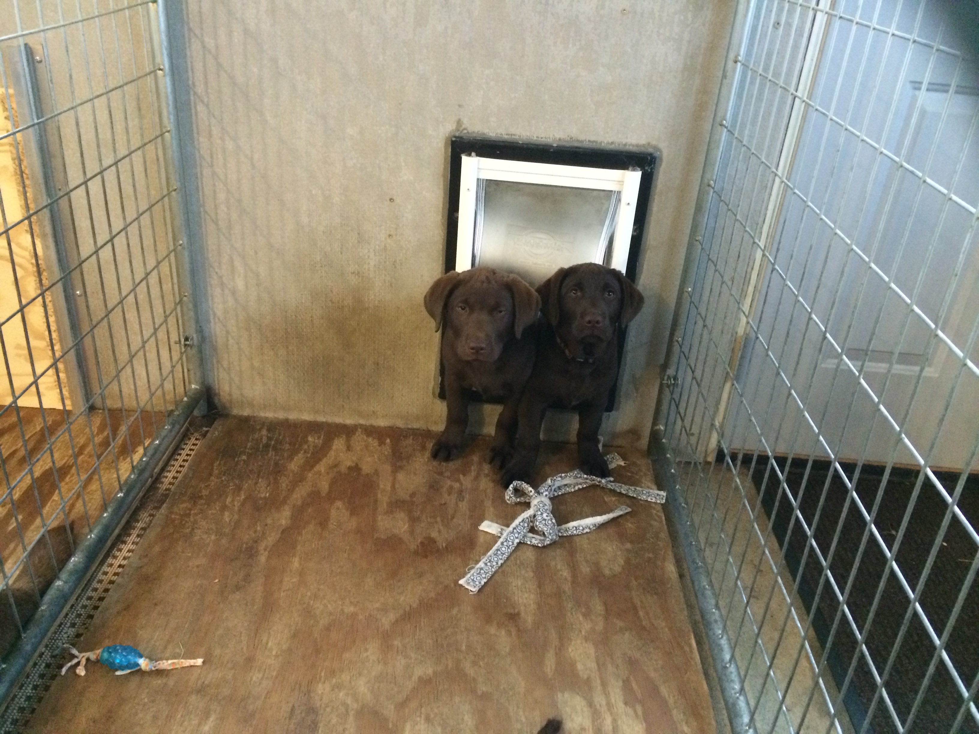 The pups are now being crate trained and housebroken. I've make a chute from one of the kennel runs out to their play area outside. The pups are now going outside by themselves when they need to potty. Sometimes they don't know to go through the dog door single file Stuck pups . Belle, the Light Blue girl, had to back out so Mr. Black could go through. Chew fest . Ellie has been supervising the pups and enjoying their treats.