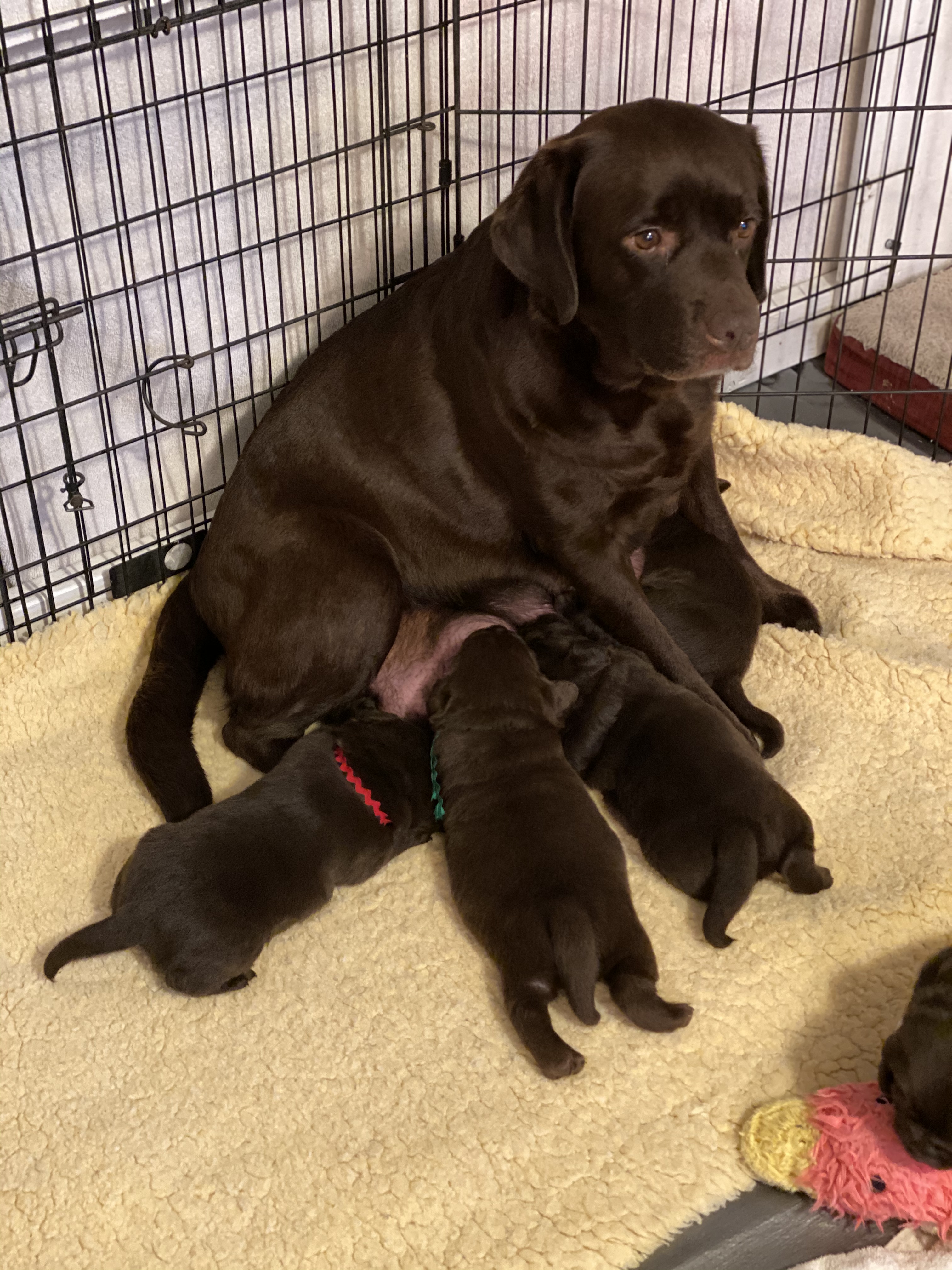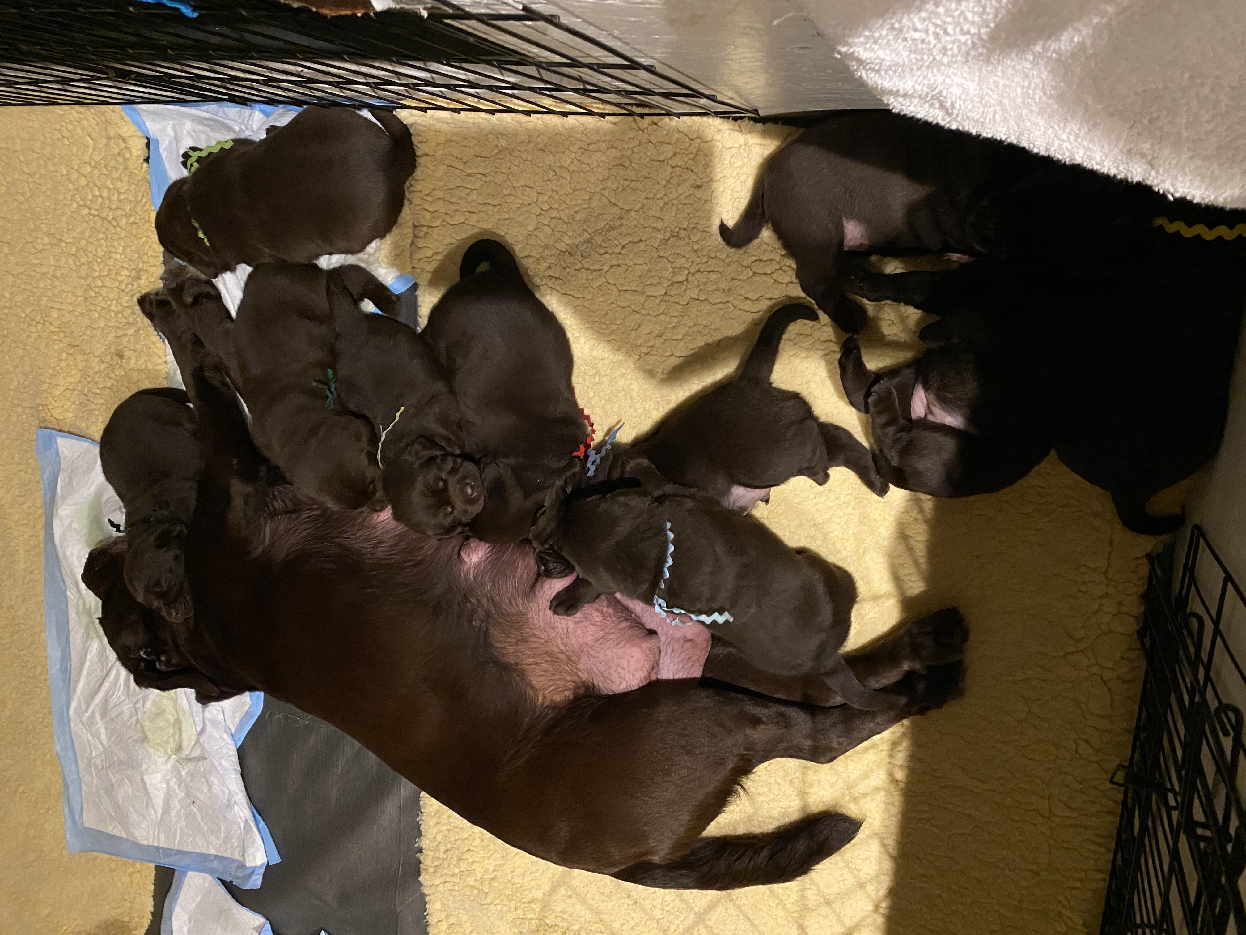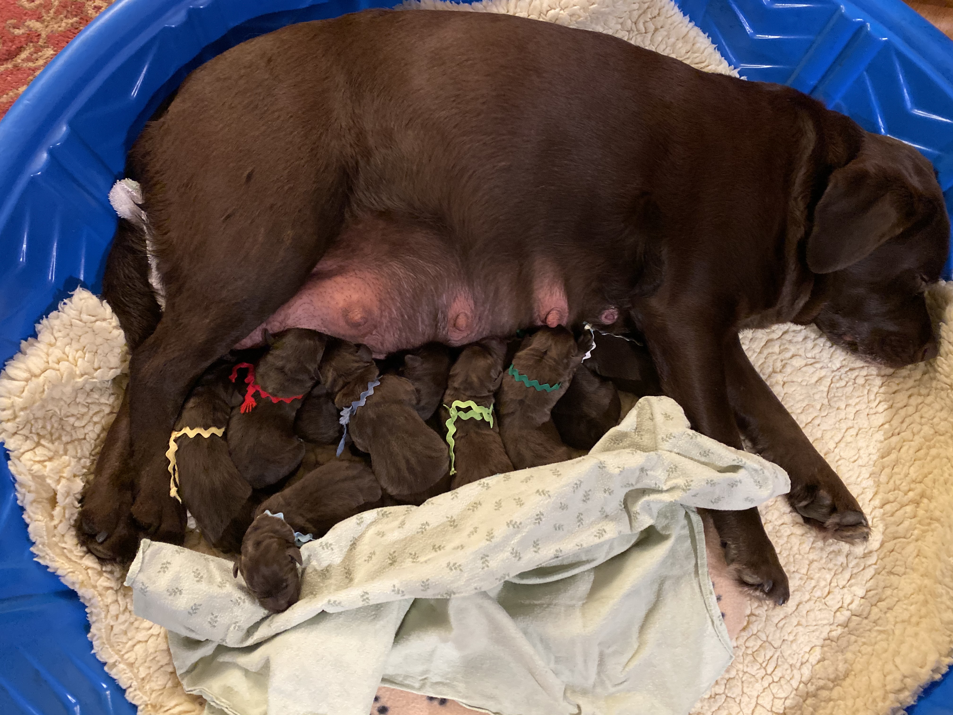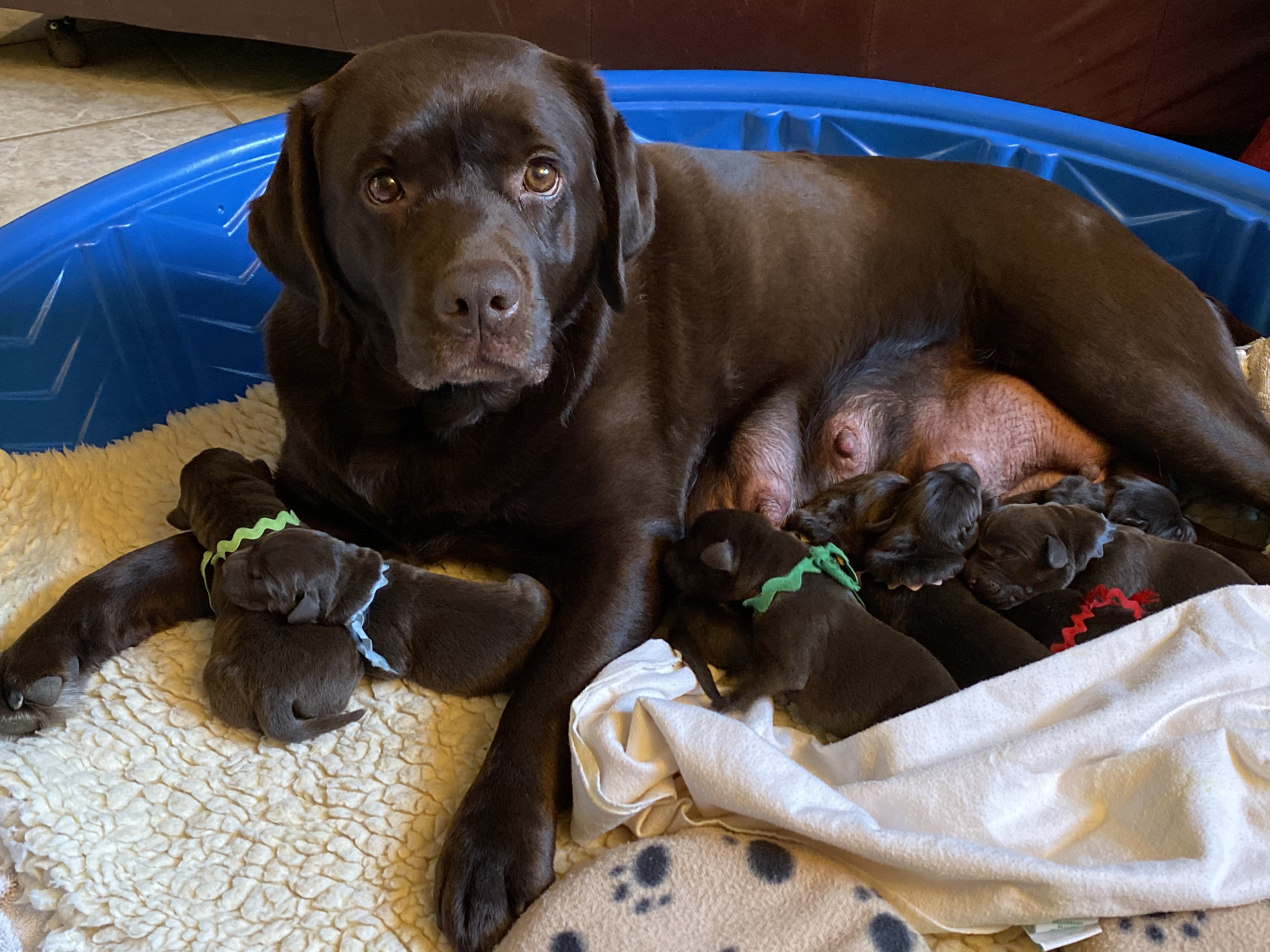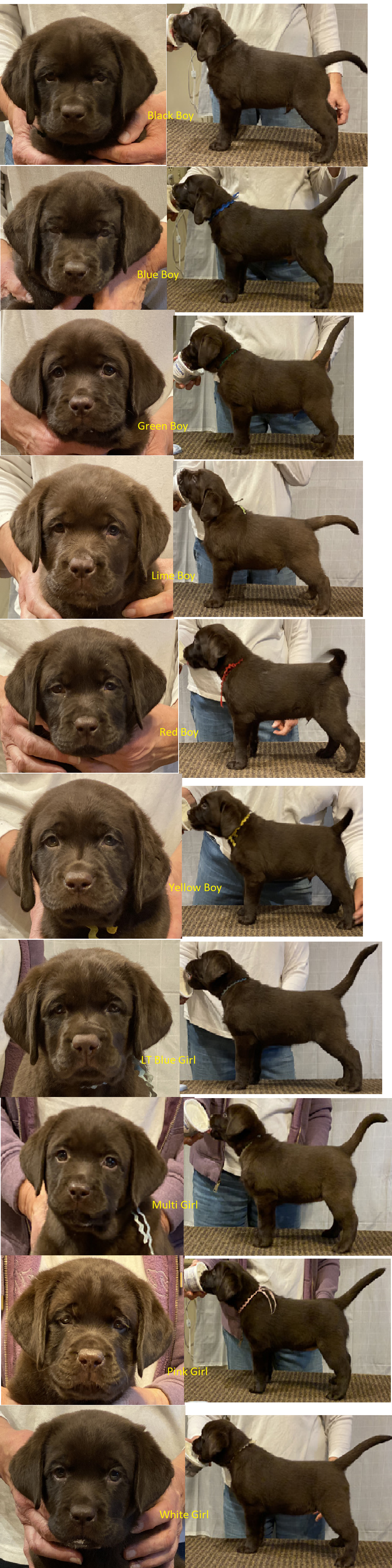 The litter will be all chocolate puppies. Ultrasound is the second week of October and the litter will be due November 13 +/- 2 days.