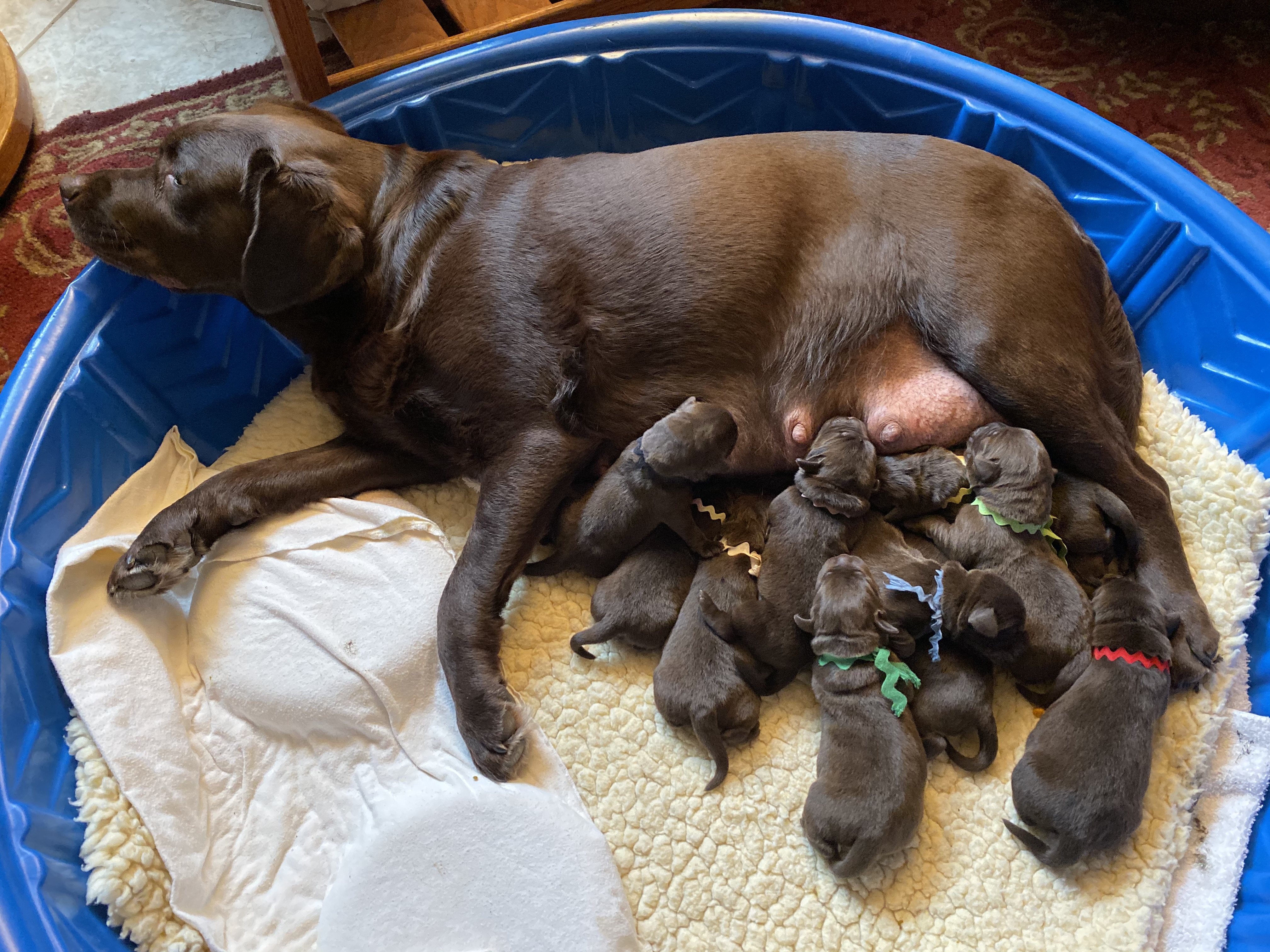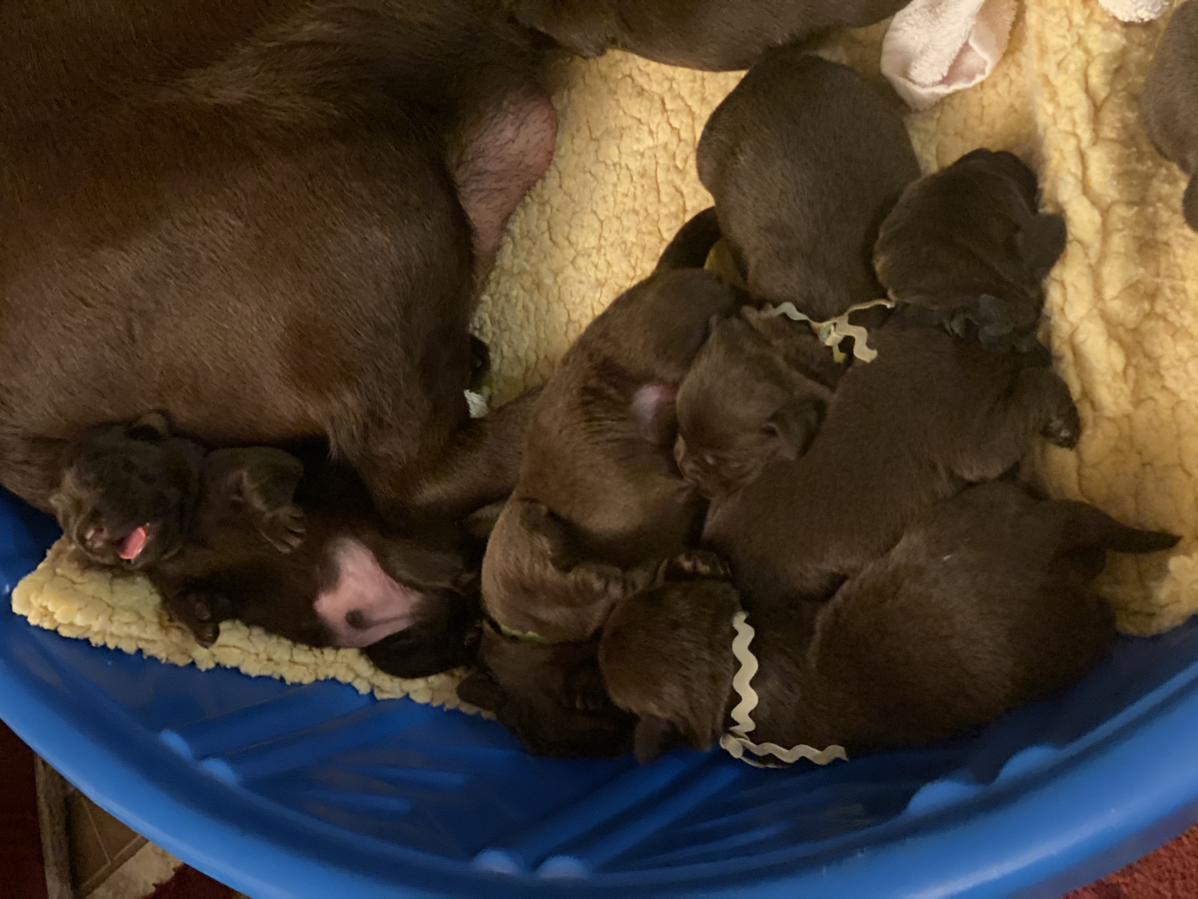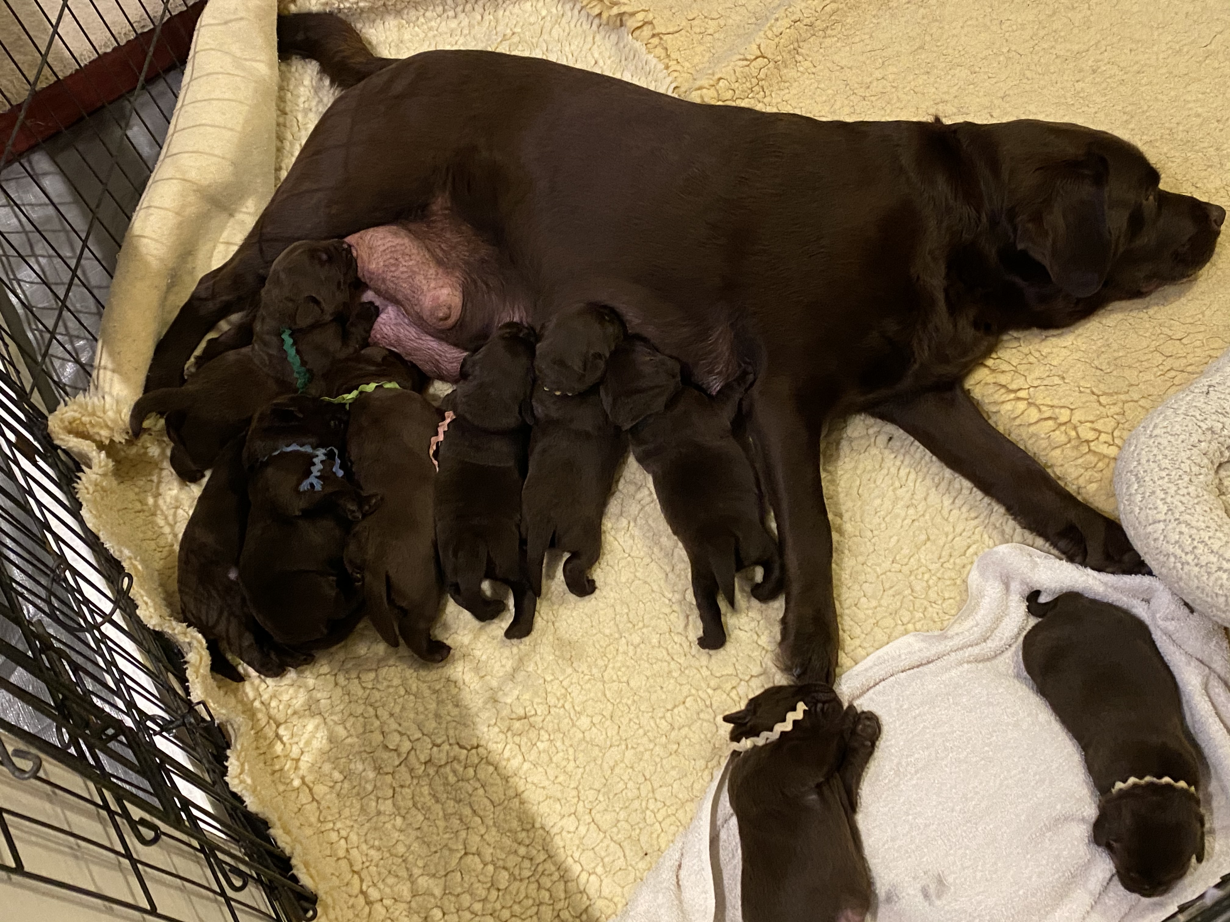 She delivered 11 pups, 6 males, 4 females and one tiny female that was stillborn.