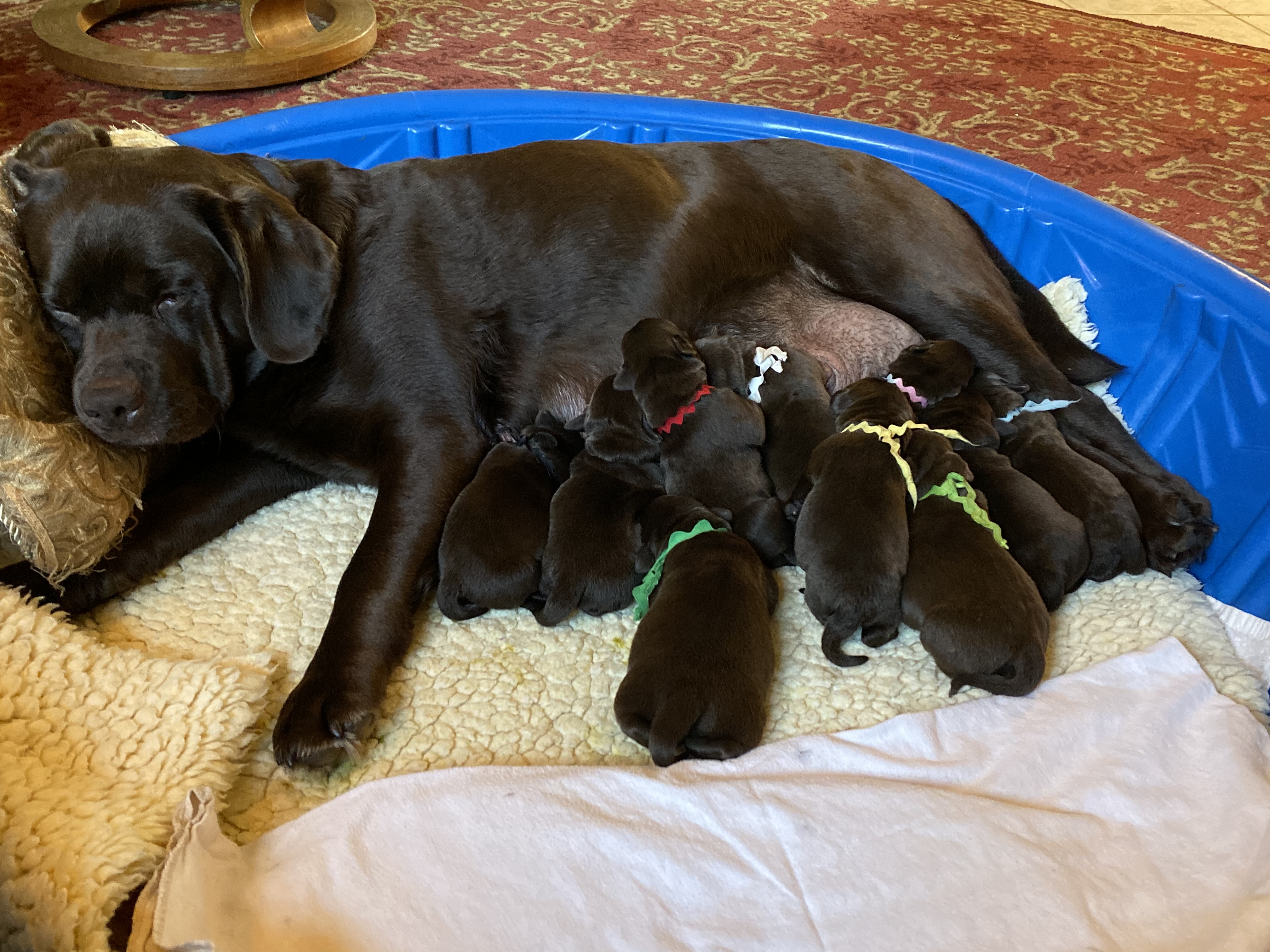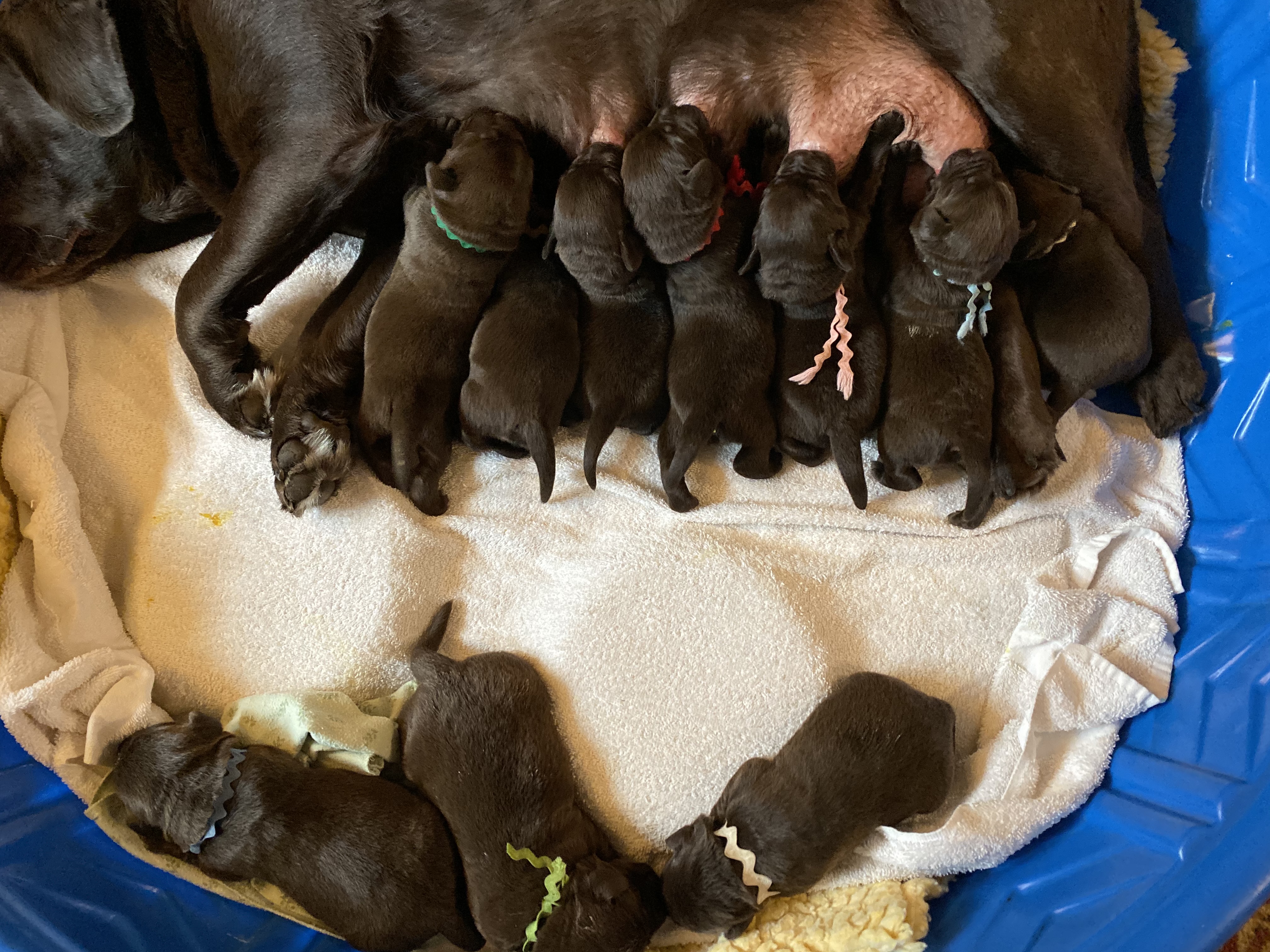 Beckett started labor Sunday morning and had the first pup, Pink girl, around 4:30. She finished up after 2am on Monday.