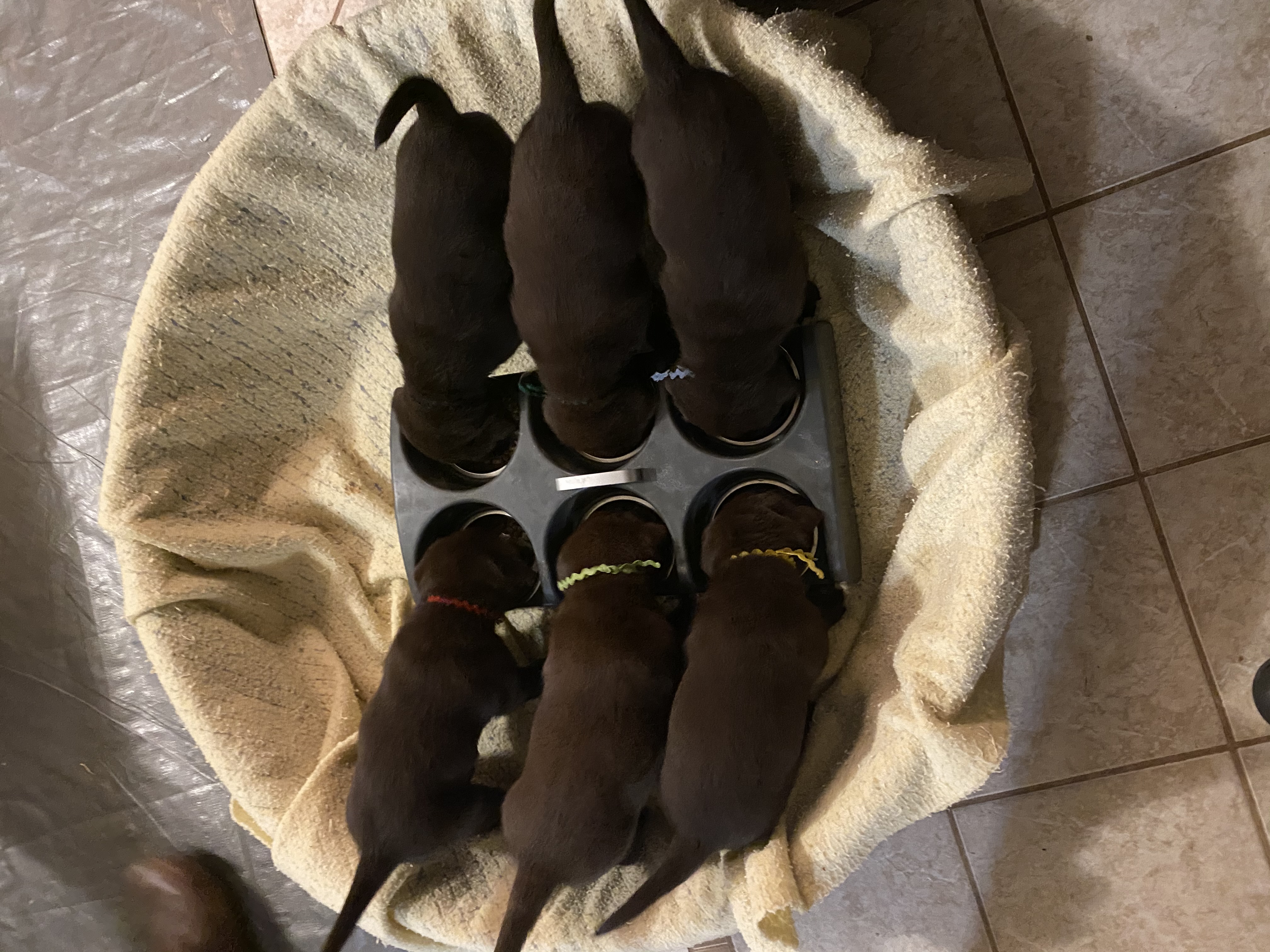 One week old today! Starting to get a little more sleep at night. Have to feed the pups in shifts, smaller ones first and then the lunkers last. They have doubled their birth weight in just a week.