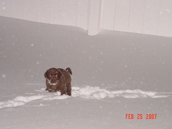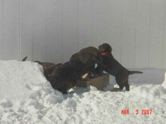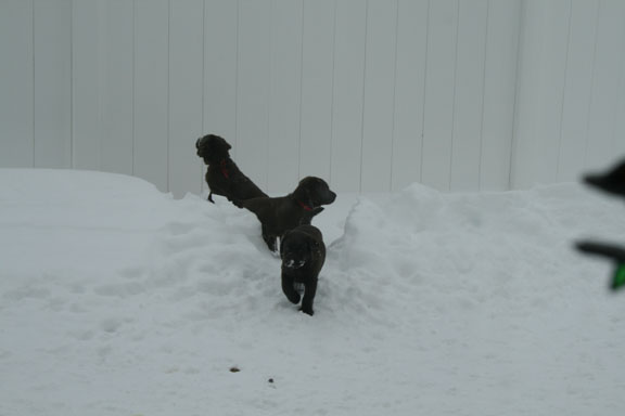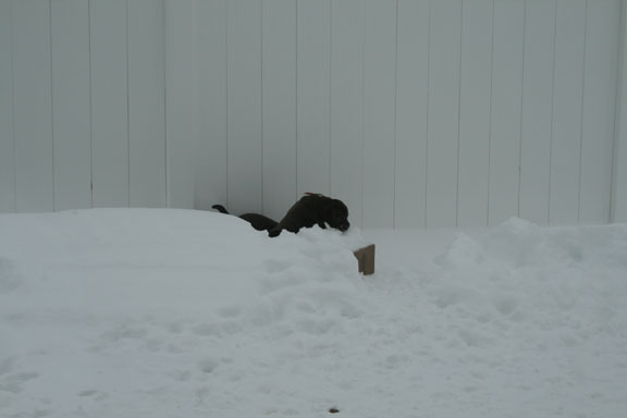 snow is starting to soften a little in the sun. Red boy got me this morning,